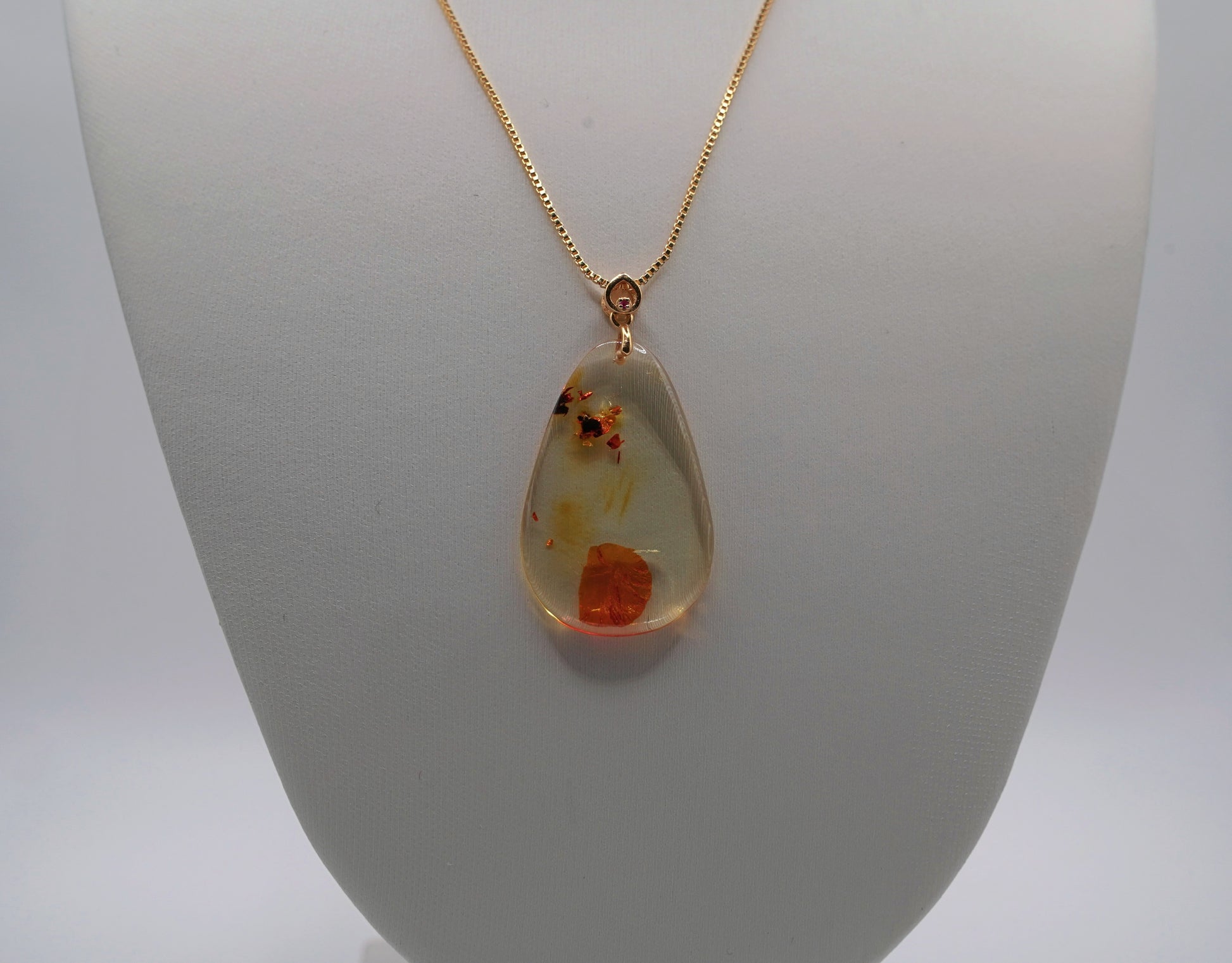 Elegant teardrop-shaped pendant crafted from clear natural amber resin, featuring embedded organic botanical elements including a preserved orange-brown petal and fine natural fragments.