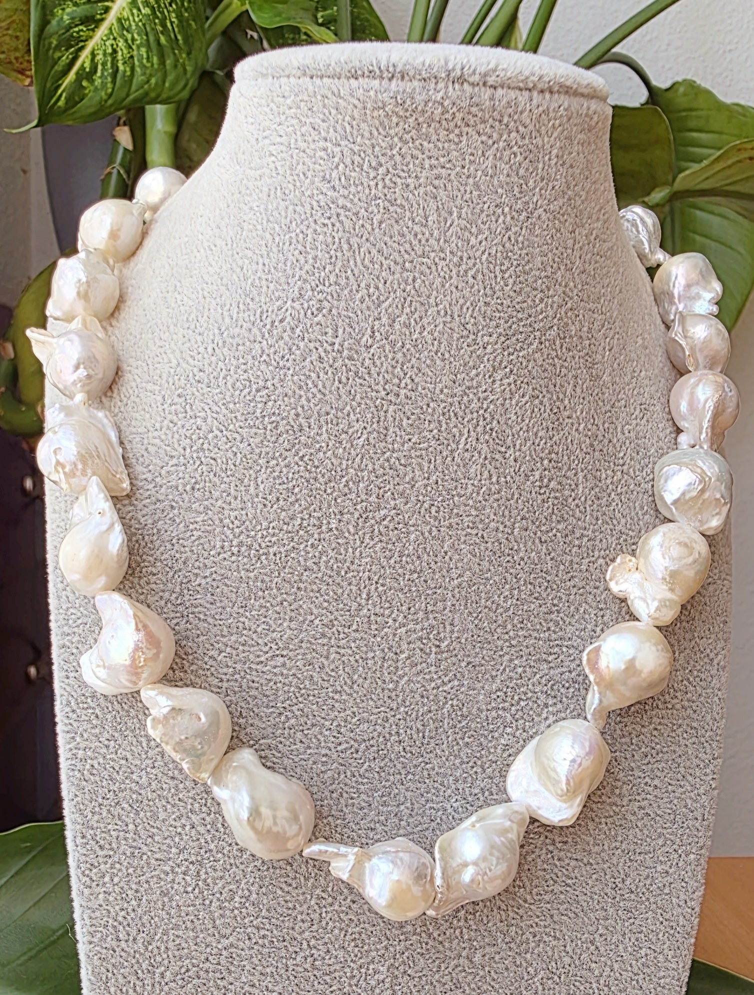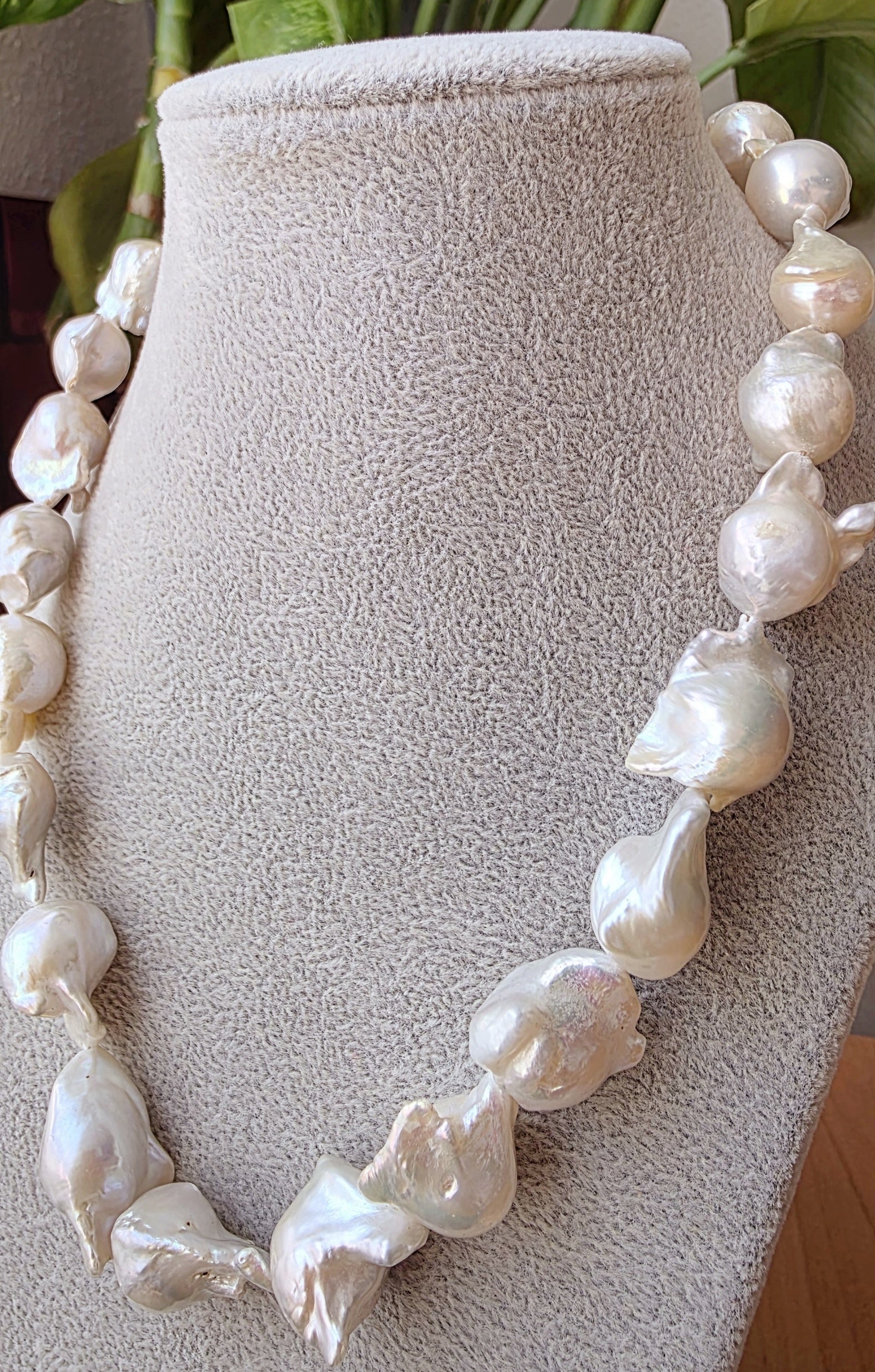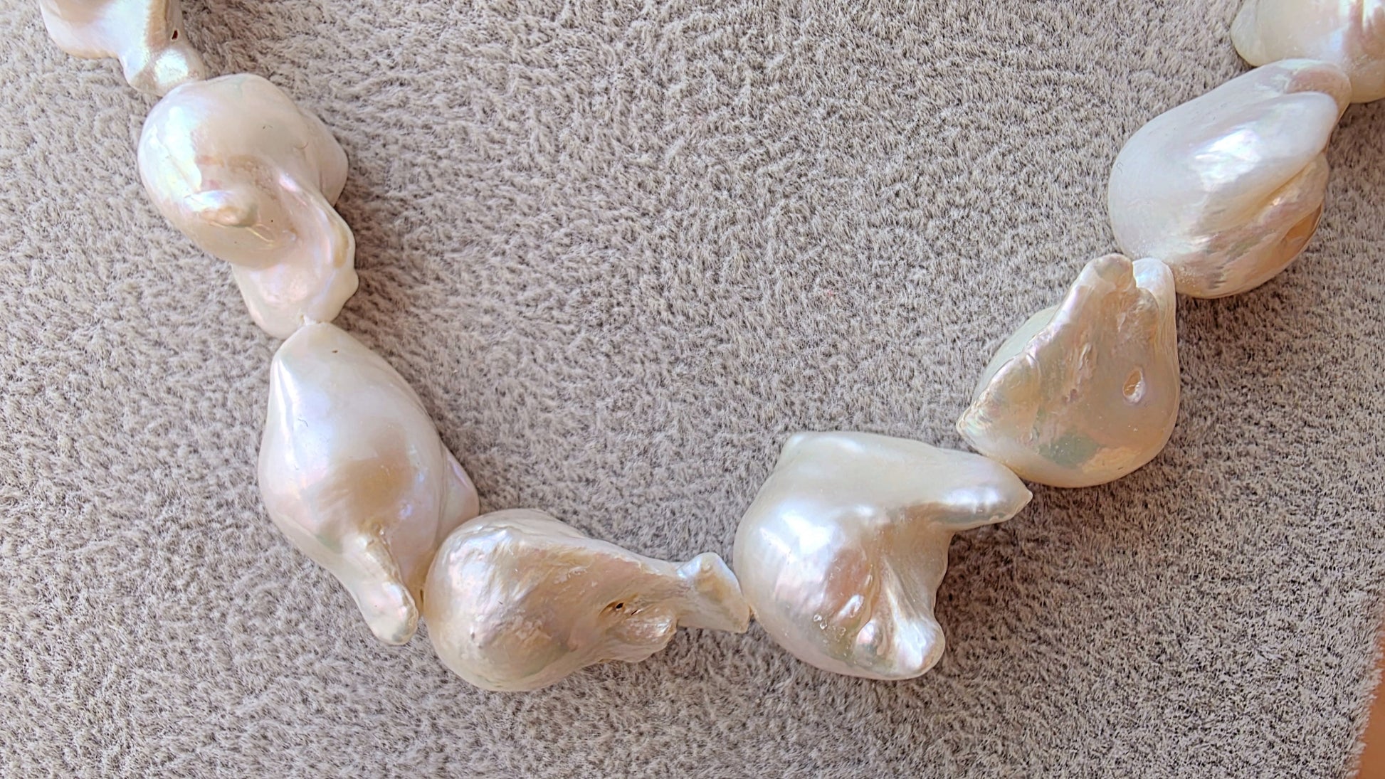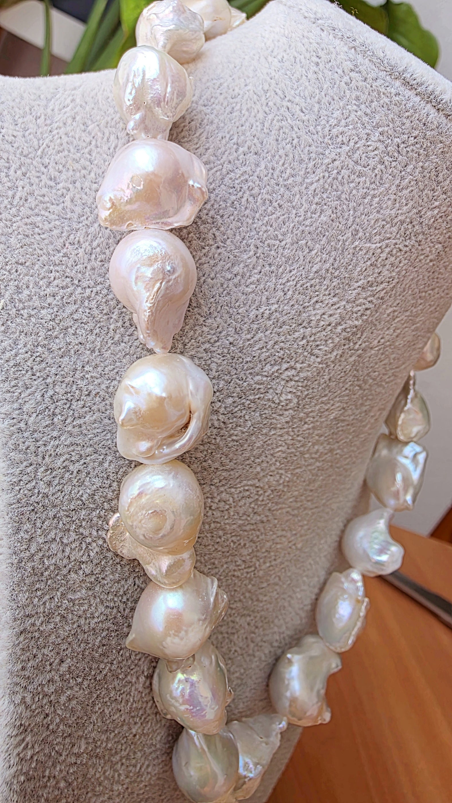 This stunning strand features large, naturally formed Baroque pearls, each showcasing unique contours and radiant nacre. The irregular shapes and high surface luster create a captivating play of light, making every pearl one-of-a-kind. Their organic beauty and substantial size reflect the rarity and artisanal value of true Baroque pearls.
