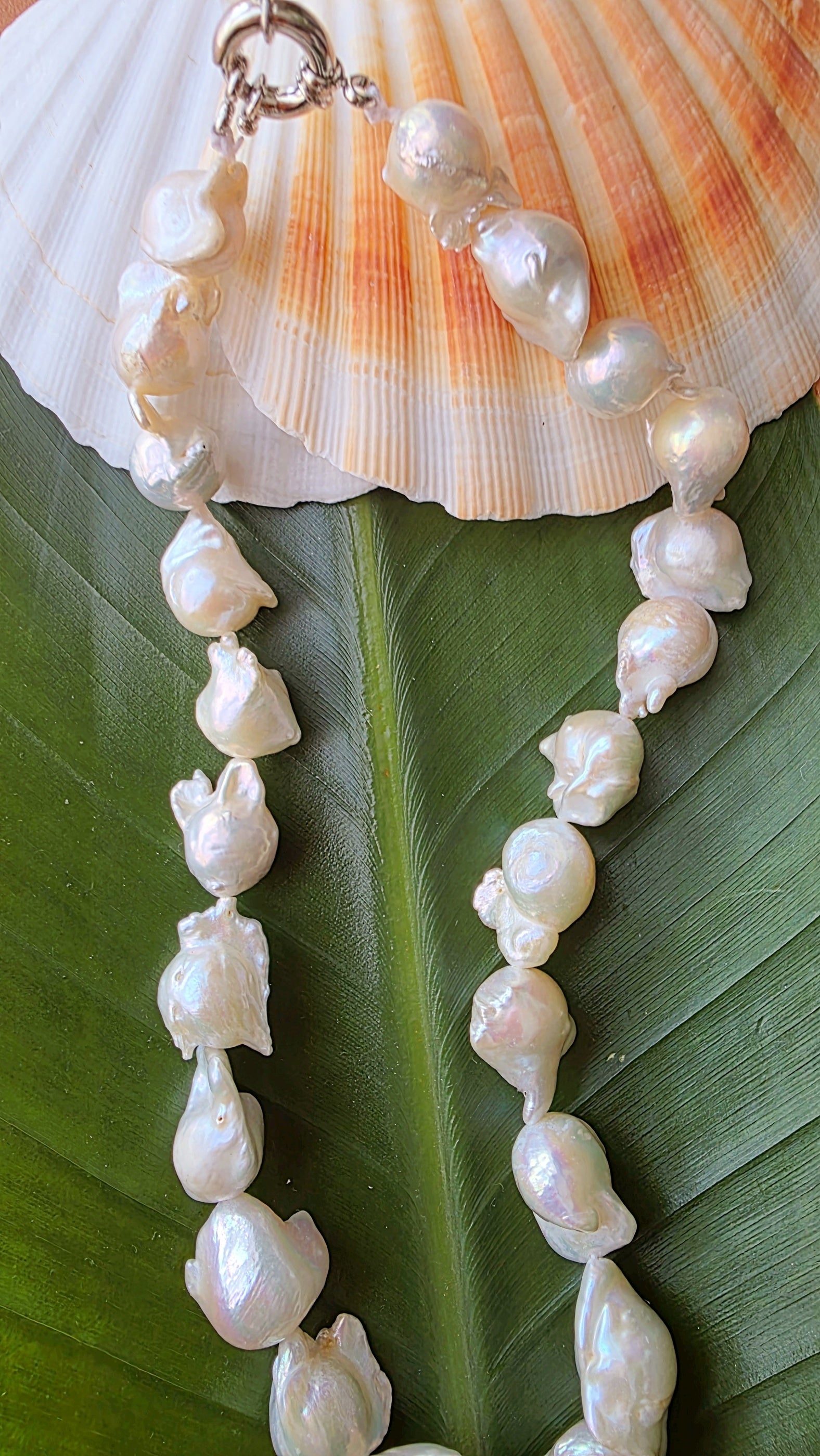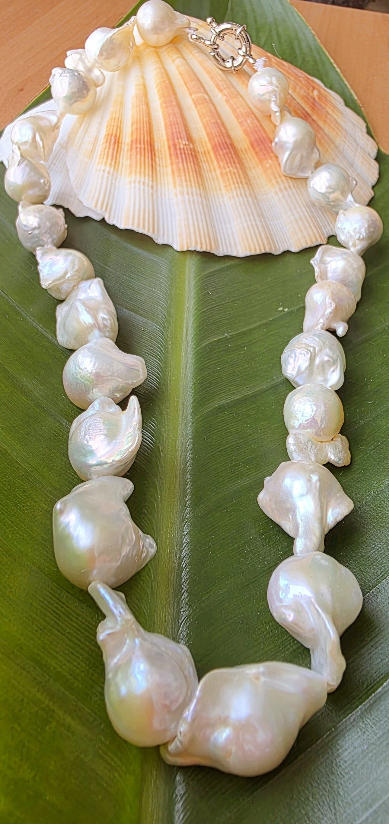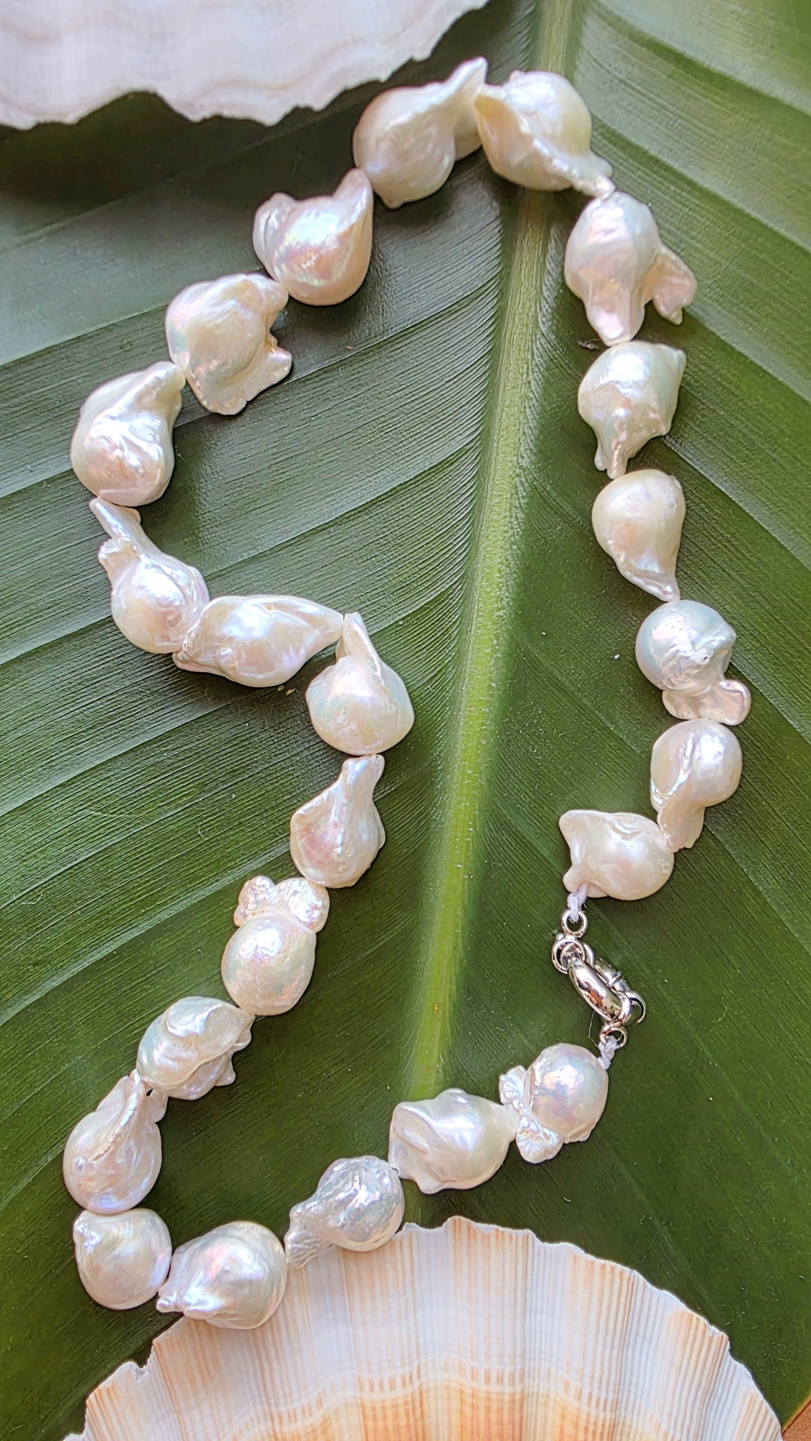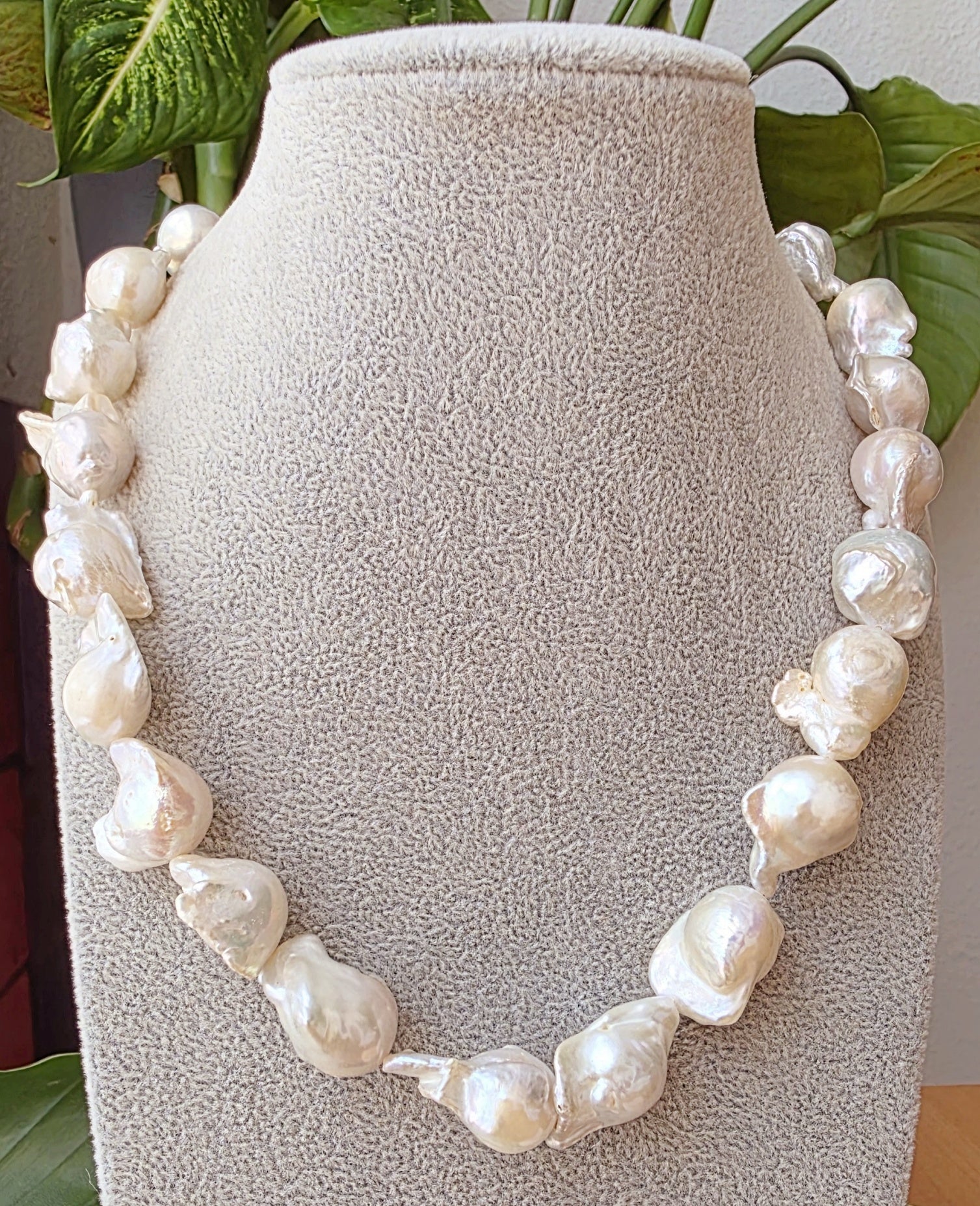 This stunning strand features large, naturally formed Baroque pearls, each showcasing unique contours and radiant nacre. The irregular shapes and high surface luster create a captivating play of light, making every pearl one-of-a-kind. Their organic beauty and substantial size reflect the rarity and artisanal value of true Baroque pearls.