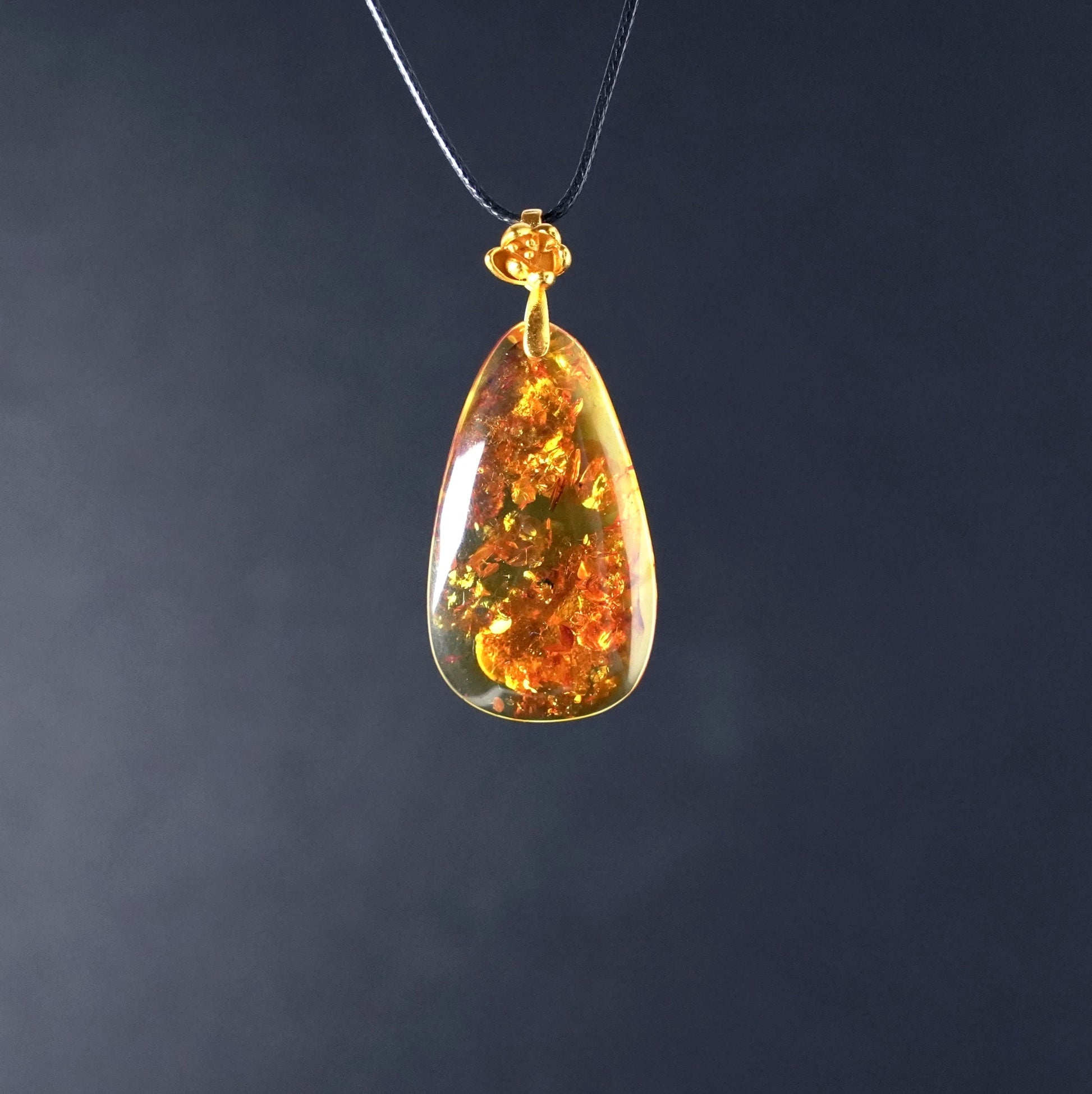 A highly translucent specimen of certified natural Burmese amber, exhibiting a warm golden-orange hue with exceptional internal clarity and abundant organic inclusions typical of authentic fossilized resin. The pendant reveals a beautiful interplay of light and internal refraction, producing characteristic “sunburst” and “honey” tones under direct illumination. The surface is finely polished to a high luster, enhancing depth and optical warmth.