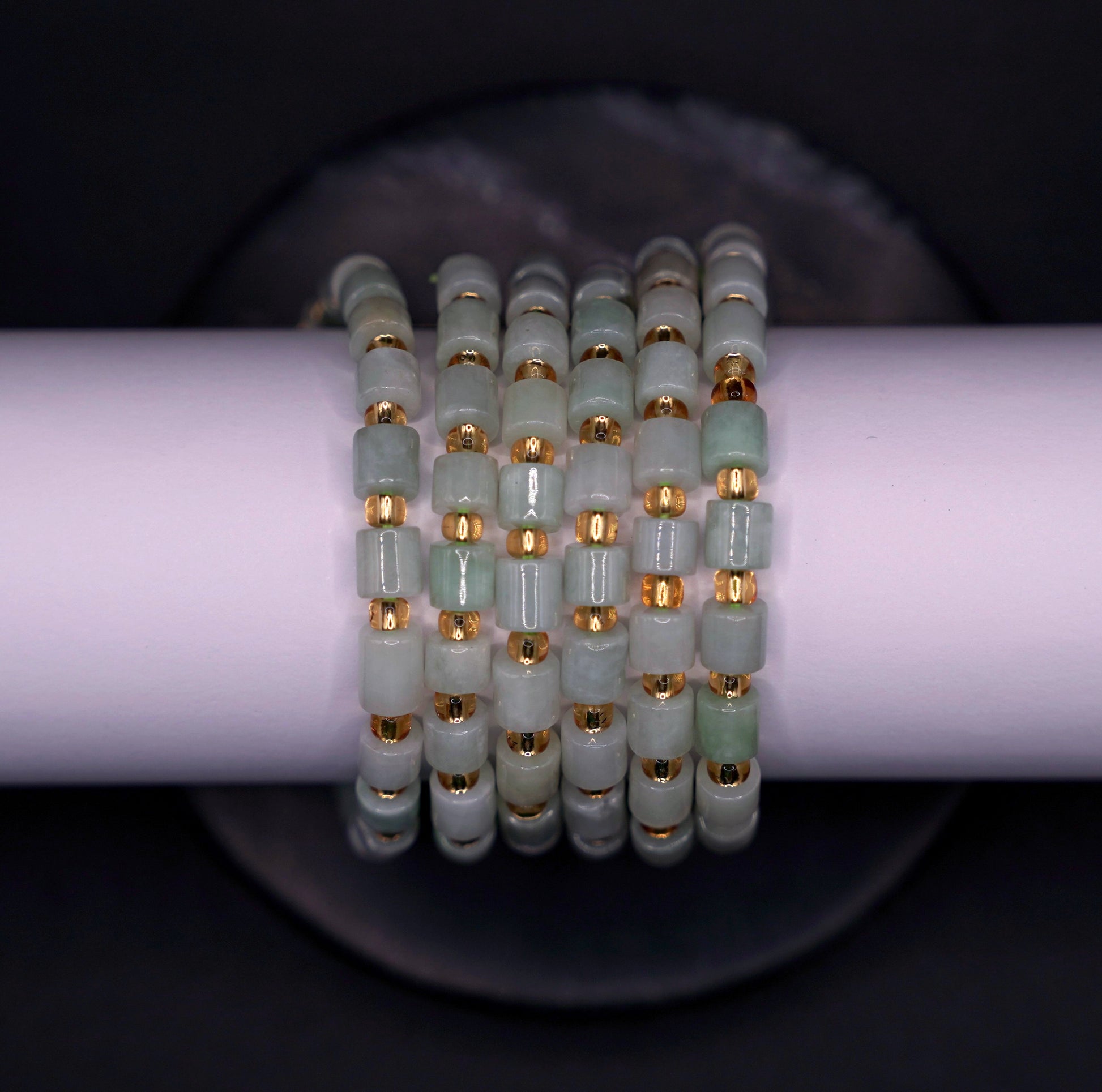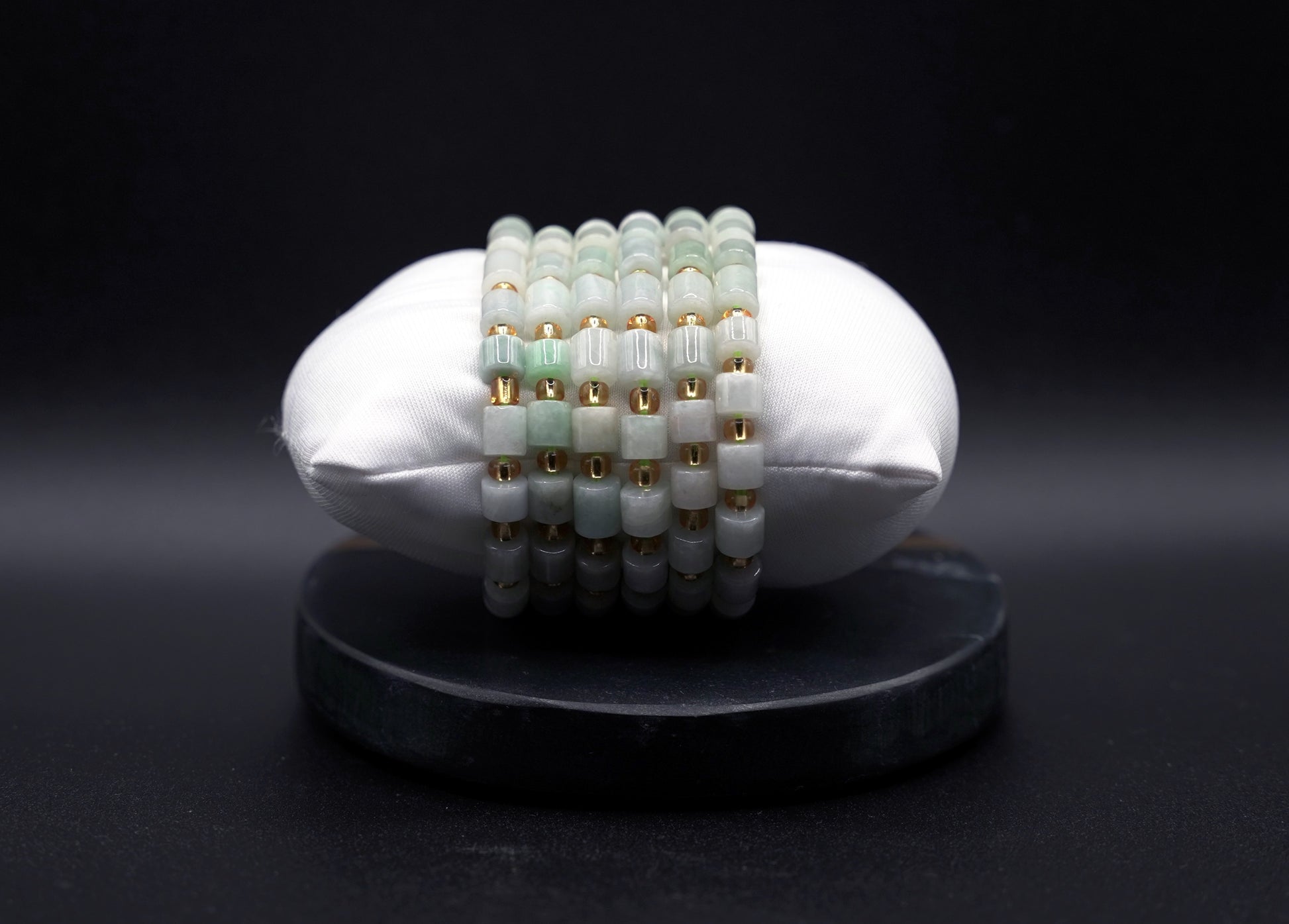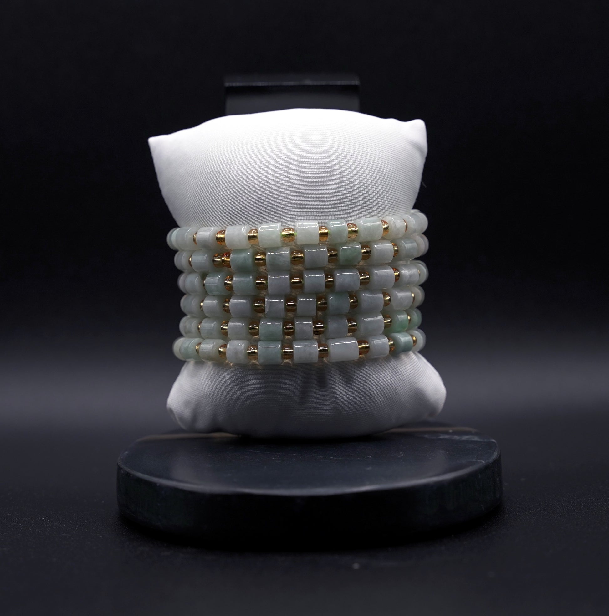 Wrap your wrist in a symphony of serenity and sophistication. This Five-Strand Jade & Gold Bracelet Stack features hand-polished cylindrical jadeite beads in soft green and milky white tones, interwoven with gleaming gold-plated spacers. The layered design evokes balance, prosperity, and timeless elegance—perfect for collectors who seek beauty with meaning.