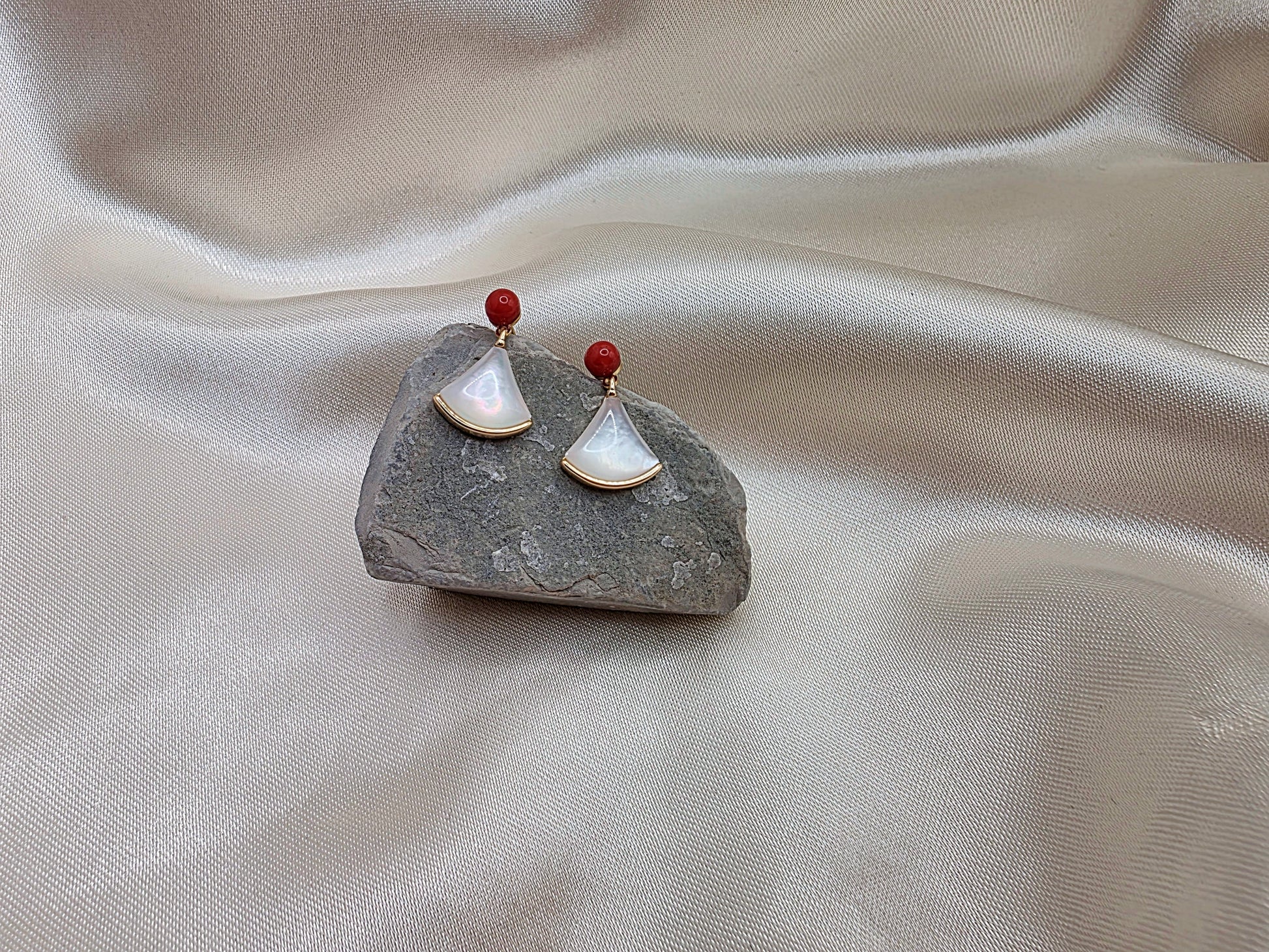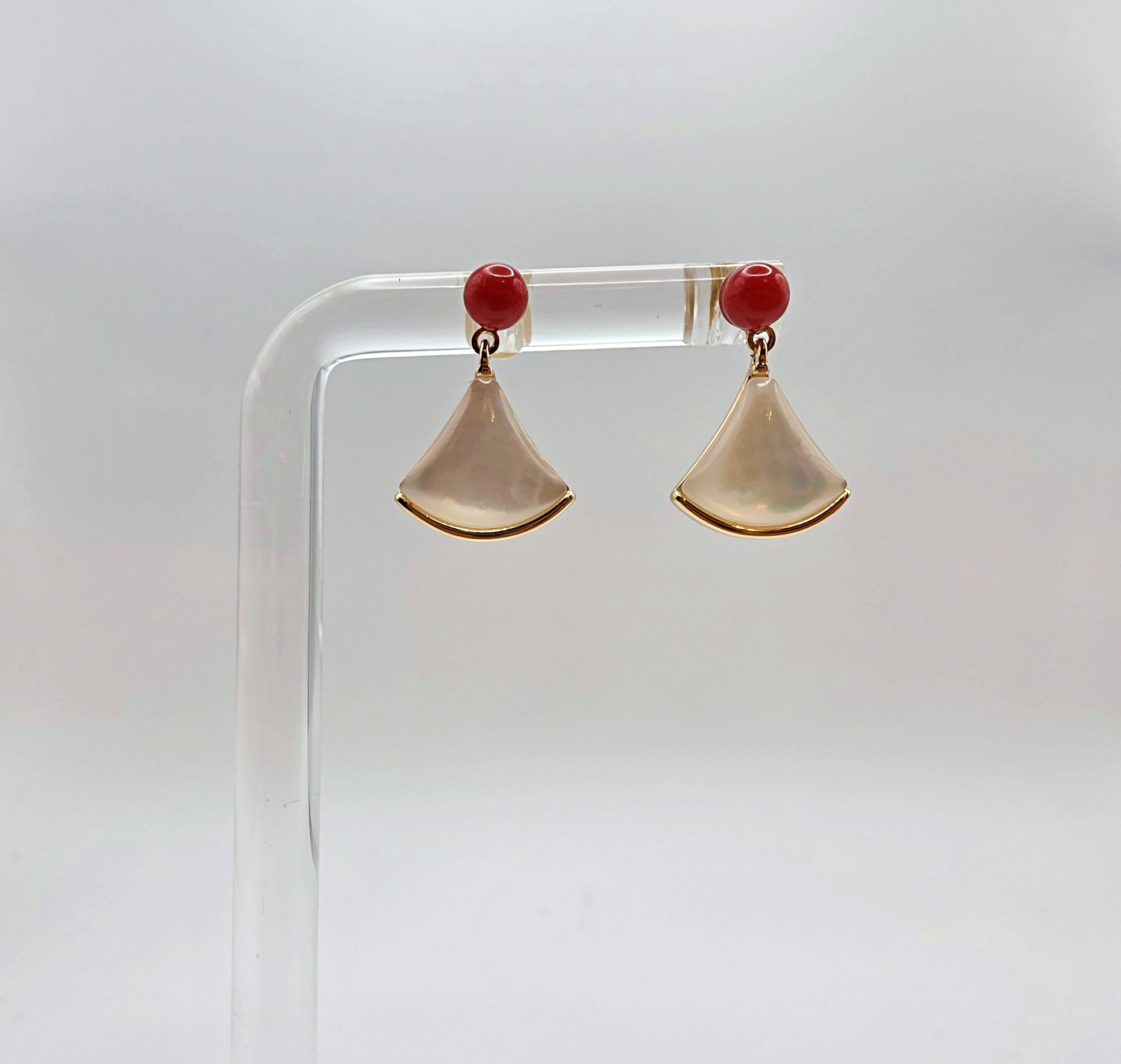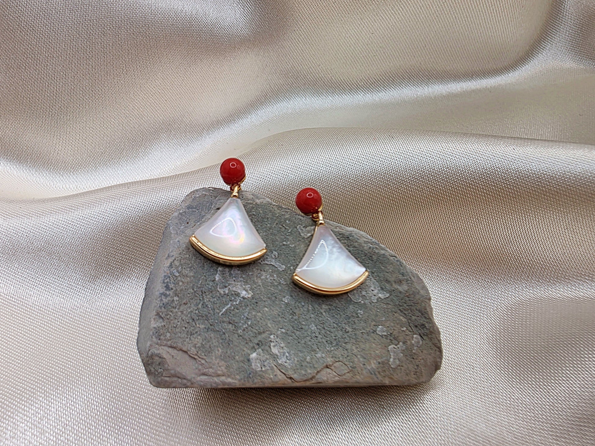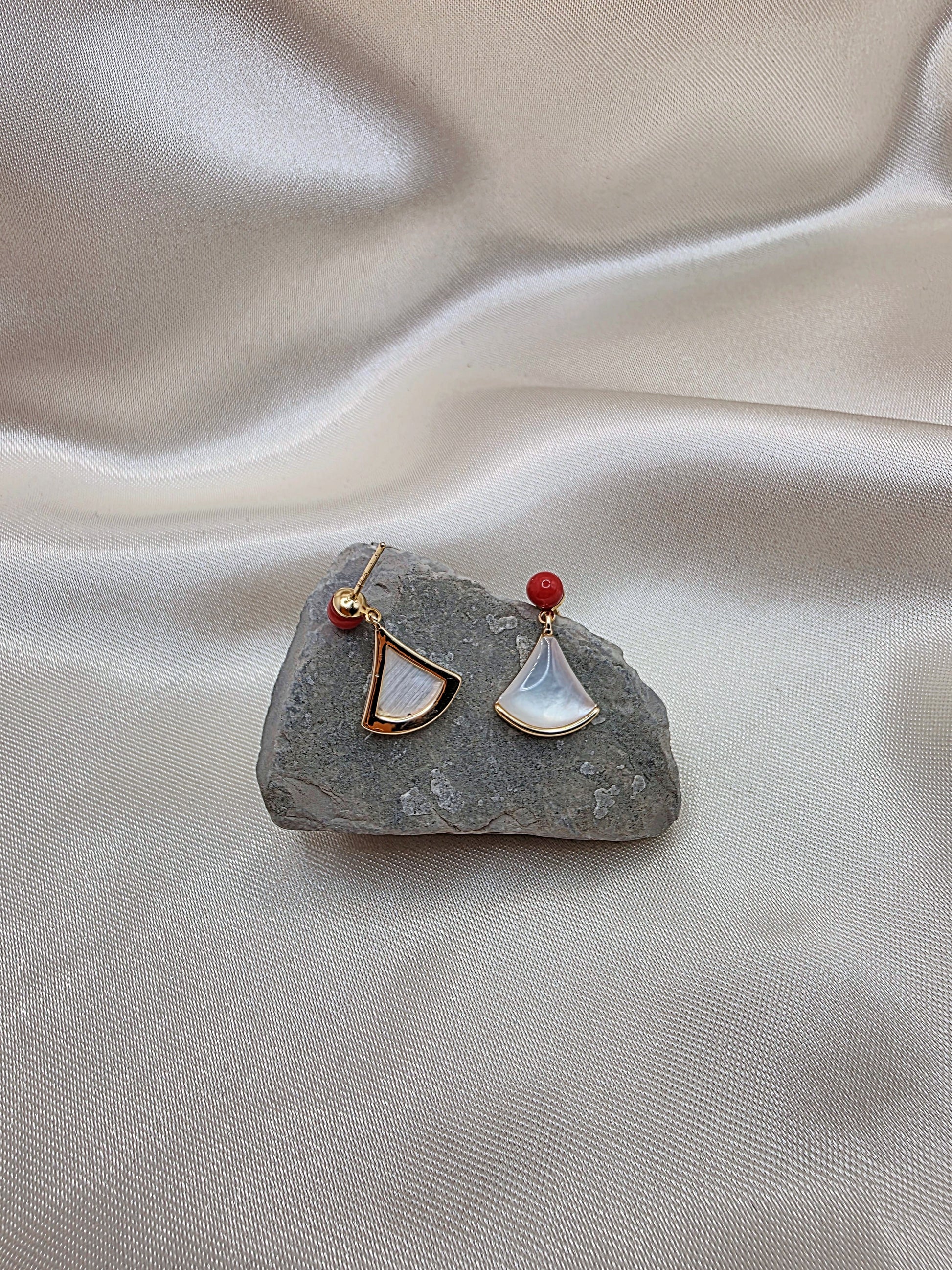 Fan-Shaped Pearl & Red Bead Earrings - Gold Trim Elegant Handmade Jewelry