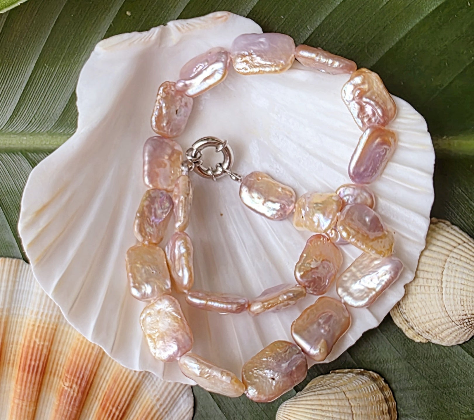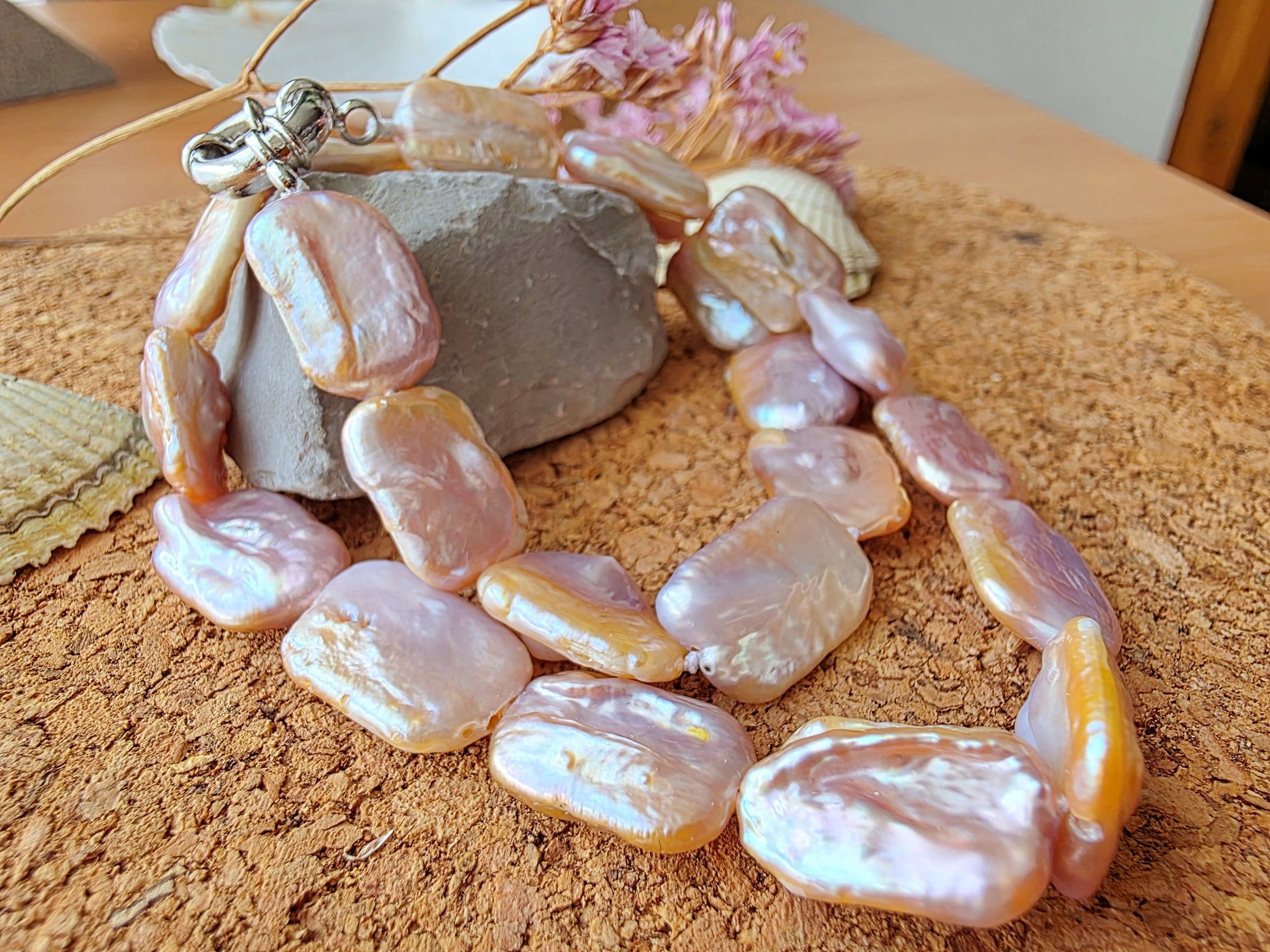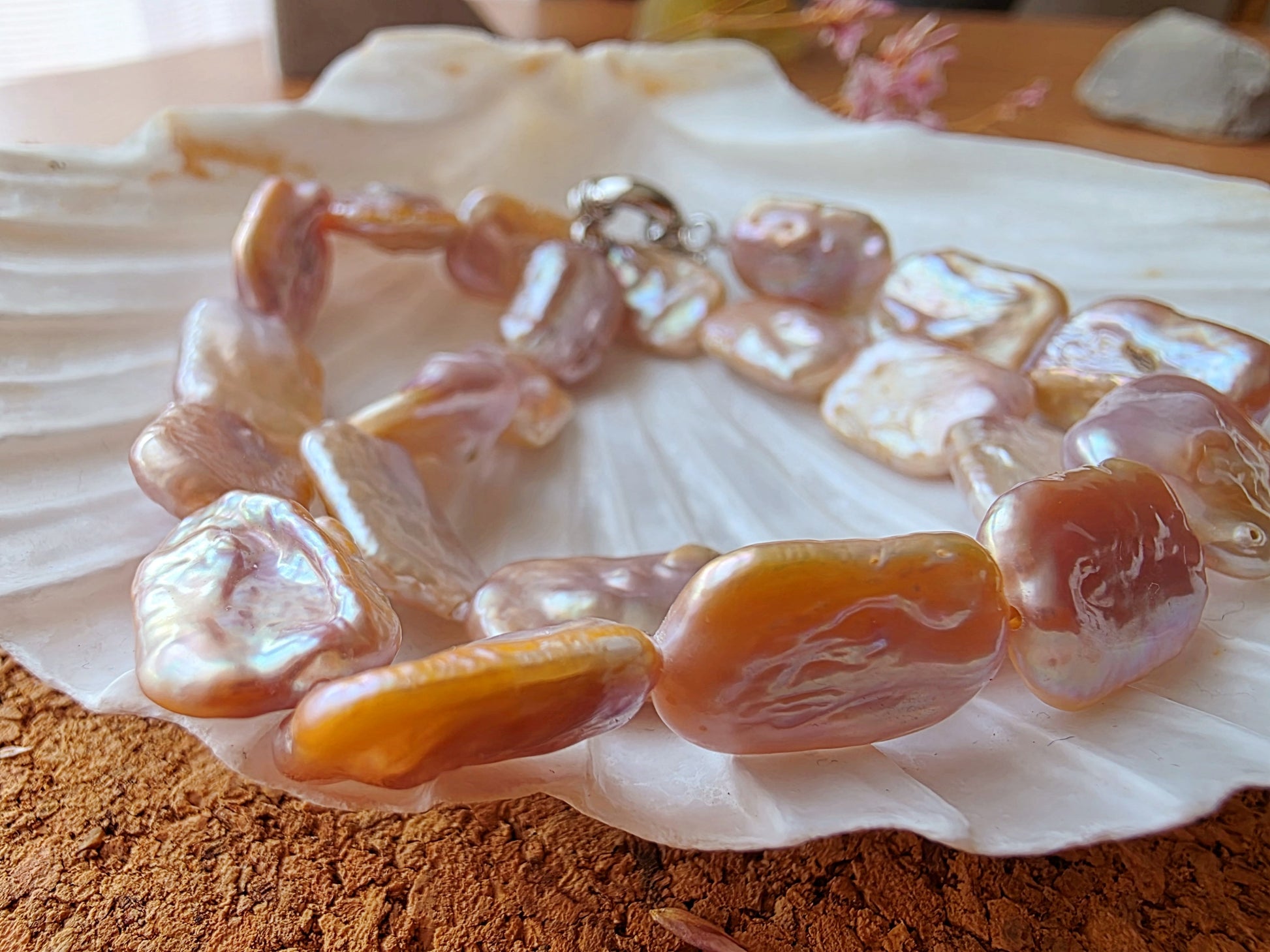 This refined necklace showcases a full strand of natural Keshi pearls, each uniquely shaped and composed entirely of nacre. The pearls exhibit a radiant play of iridescent hues—soft pinks, golds, and silvers—highlighting their organic origin and high surface luster. Formed without a nucleus, Keshi pearls are prized for their purity, lightweight feel, and exceptional glow.