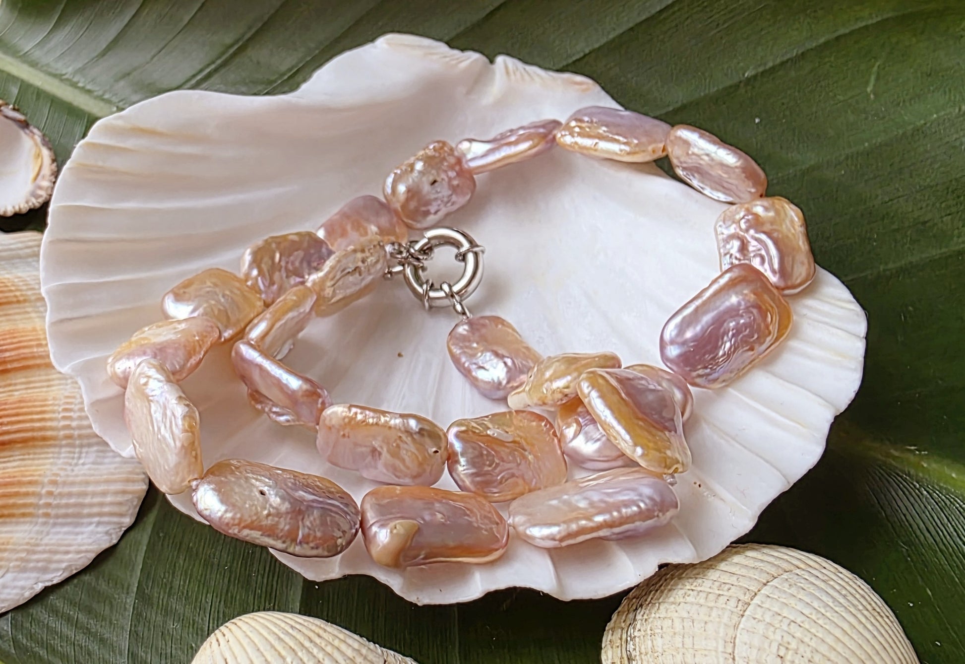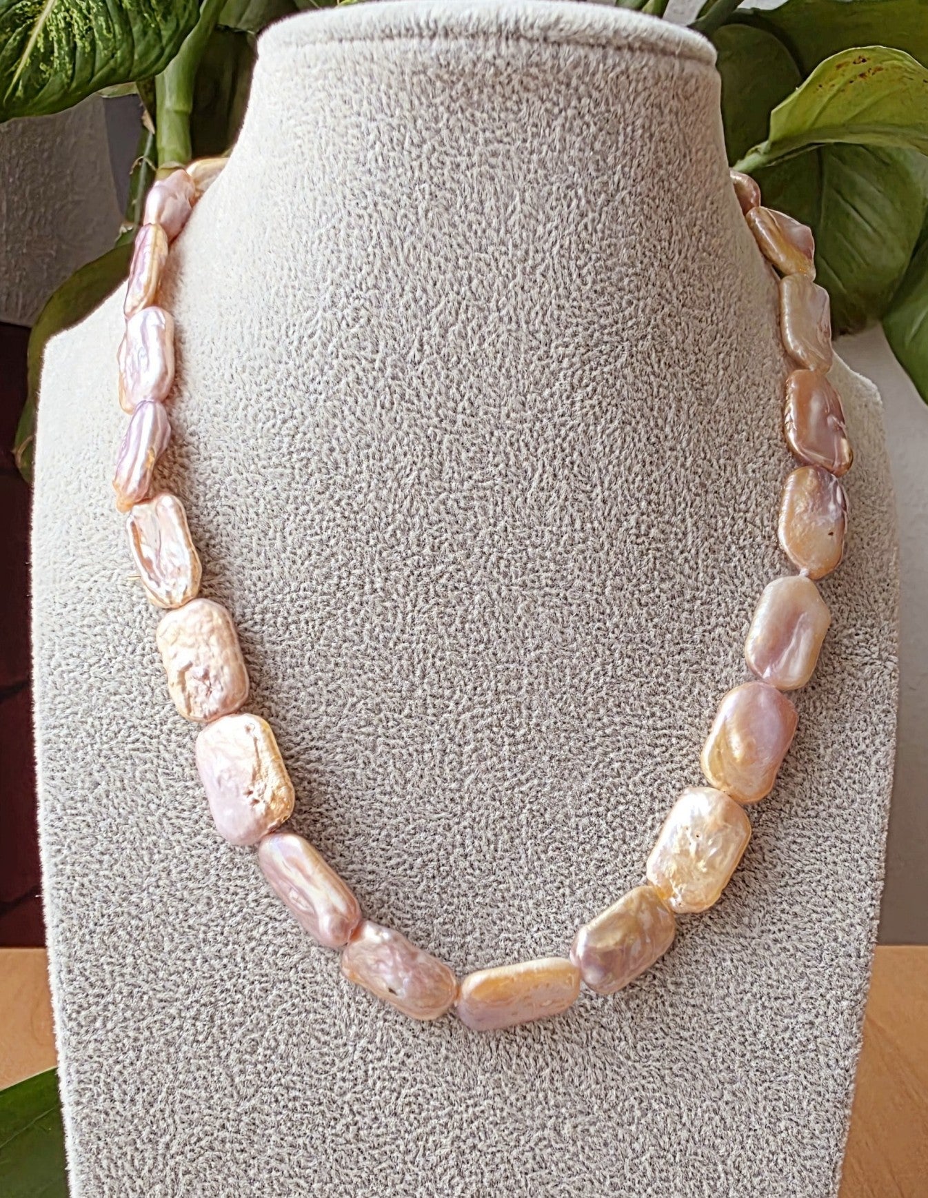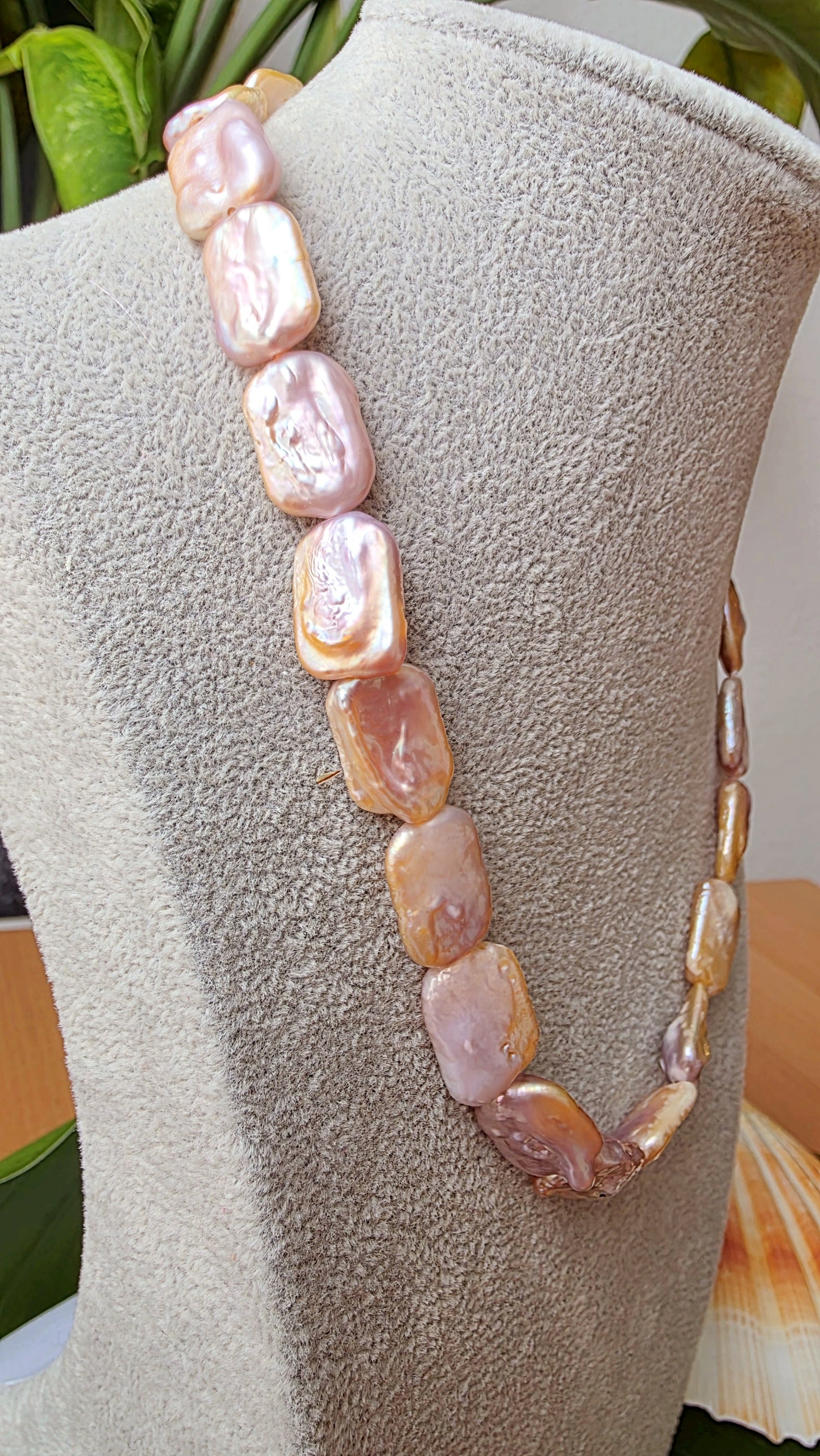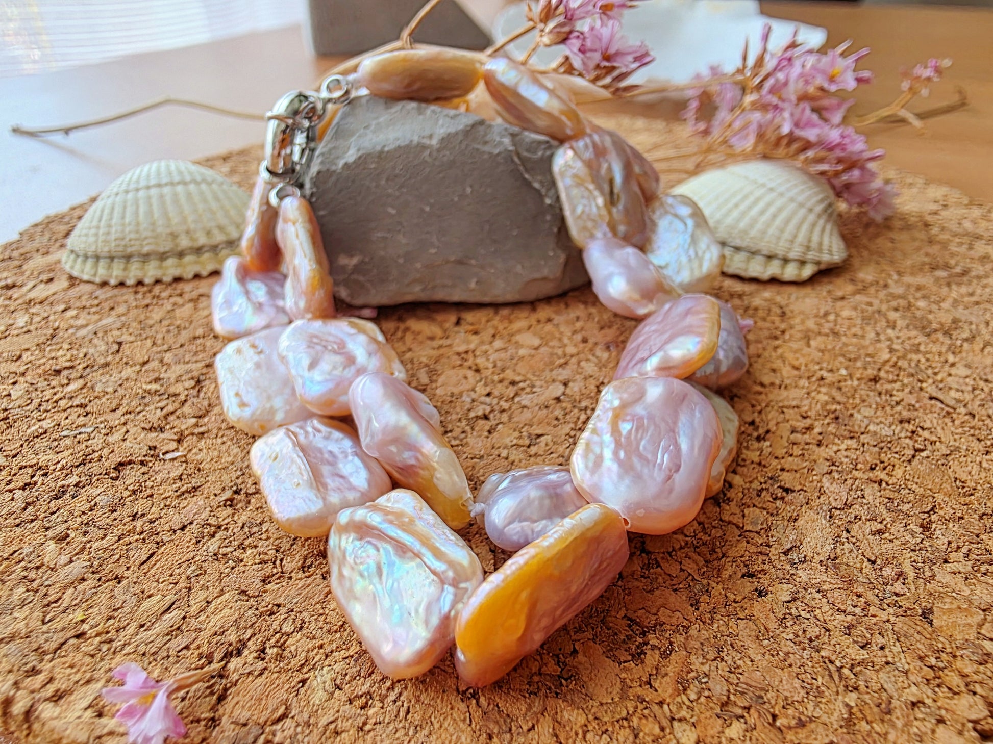 This refined necklace showcases a full strand of natural Keshi pearls, each uniquely shaped and composed entirely of nacre. The pearls exhibit a radiant play of iridescent hues—soft pinks, golds, and silvers—highlighting their organic origin and high surface luster. Formed without a nucleus, Keshi pearls are prized for their purity, lightweight feel, and exceptional glow.