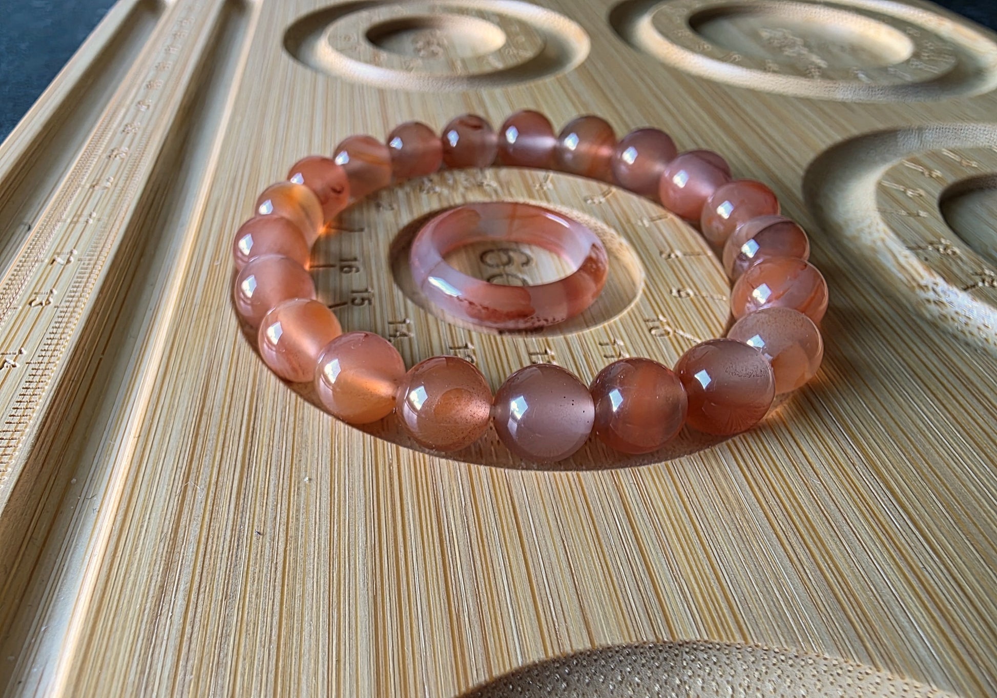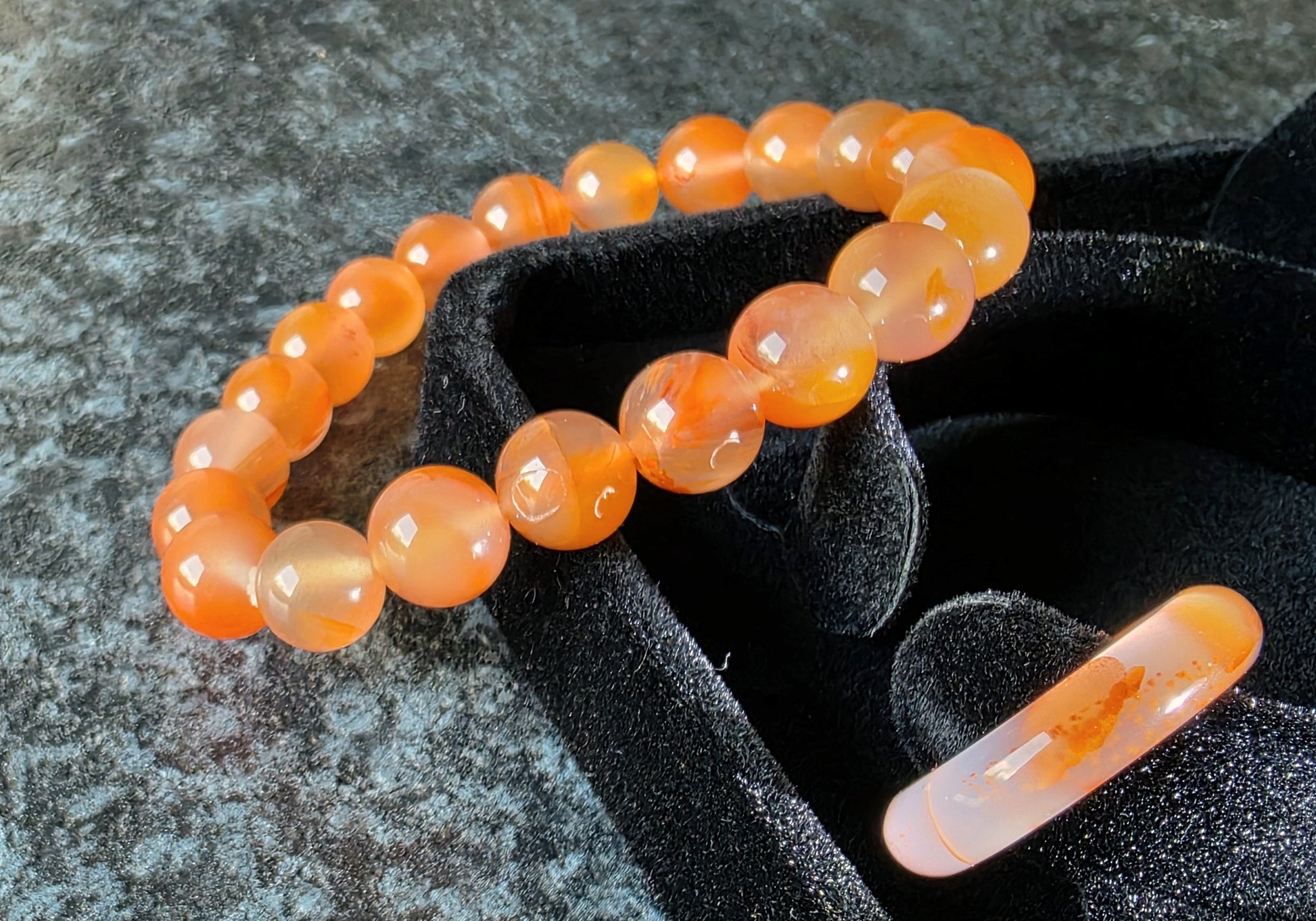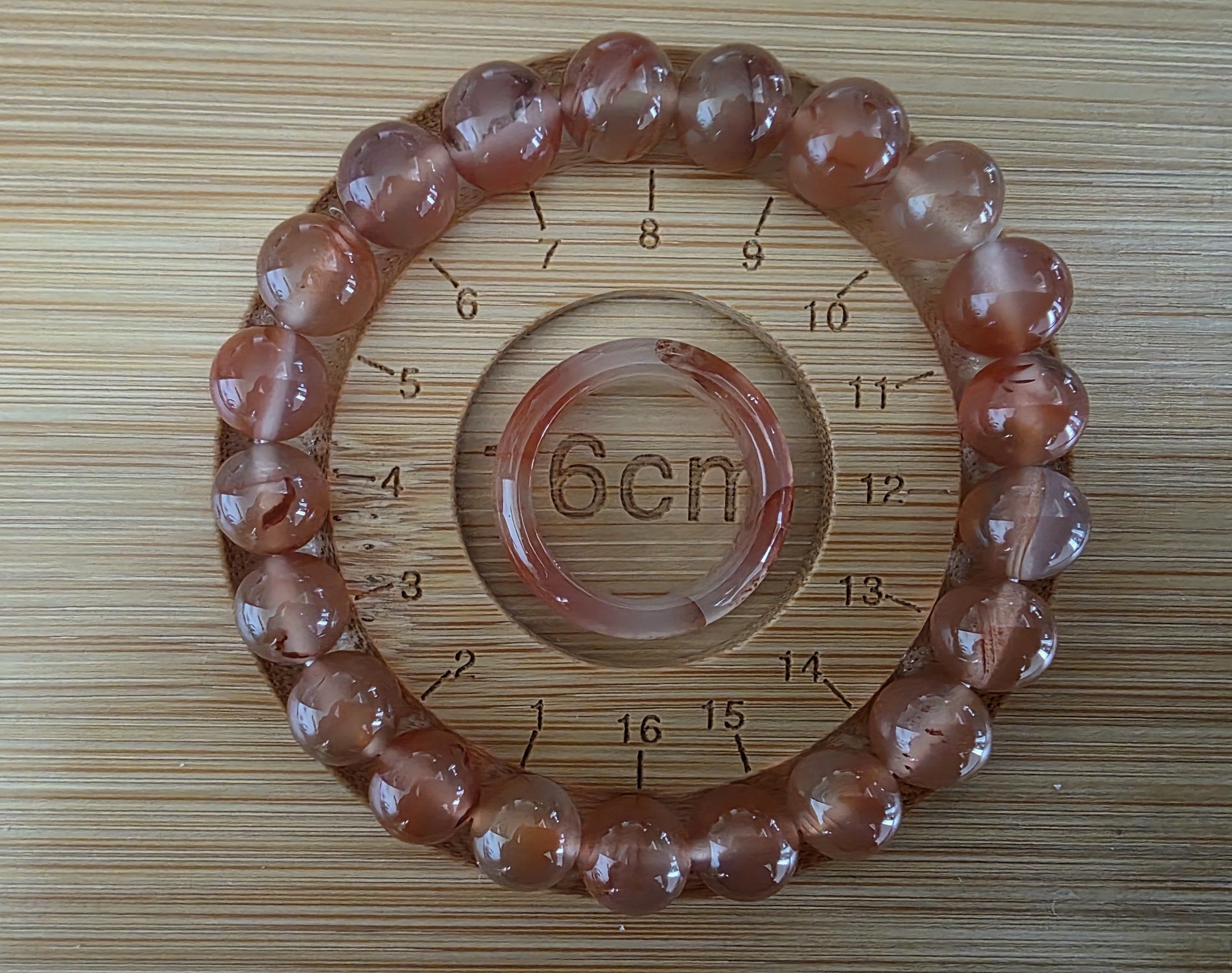 This premium 2-piece set features a matching bracelet and ring crafted from icy-grade South Red Agate (Nanhong), known for its luminous clarity and rare floating inclusions. The bracelet showcases polished round beads with a soft reddish-orange glow, while the ring complements it with a single, high-translucency centerpiece. Bracelet size 16cm, Ring size (18.2mm inner, 24.7mm outer)