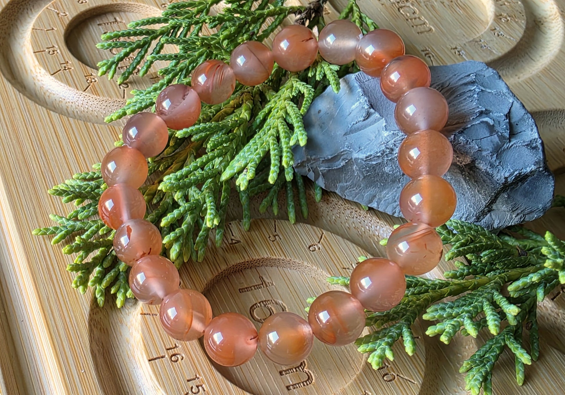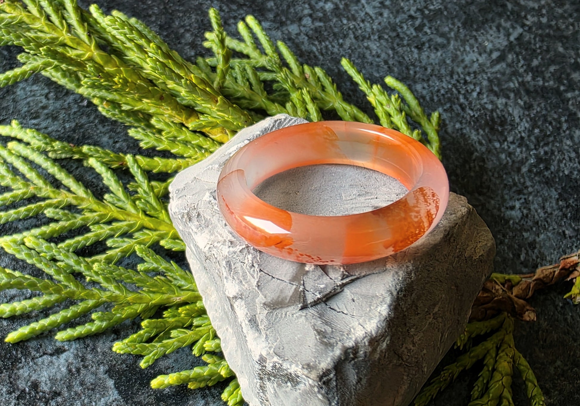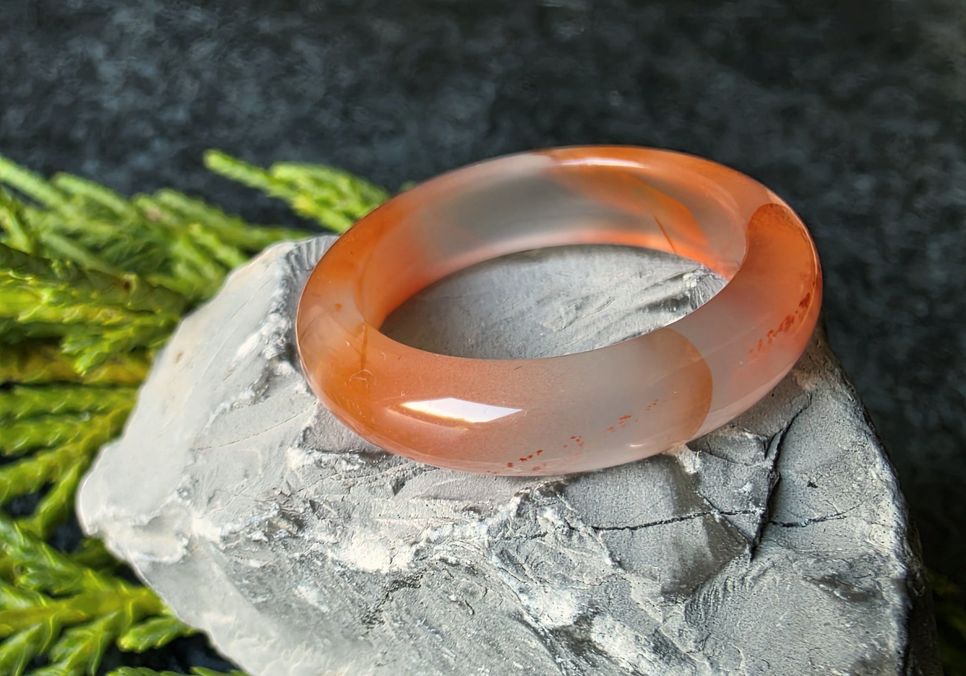 This premium 2-piece set features a matching bracelet and ring crafted from icy-grade South Red Agate (Nanhong), known for its luminous clarity and rare floating inclusions. The bracelet showcases polished round beads with a soft reddish-orange glow, while the ring complements it with a single, high-translucency centerpiece. Bracelet size 16cm, Ring size (18.2mm inner, 24.7mm outer)