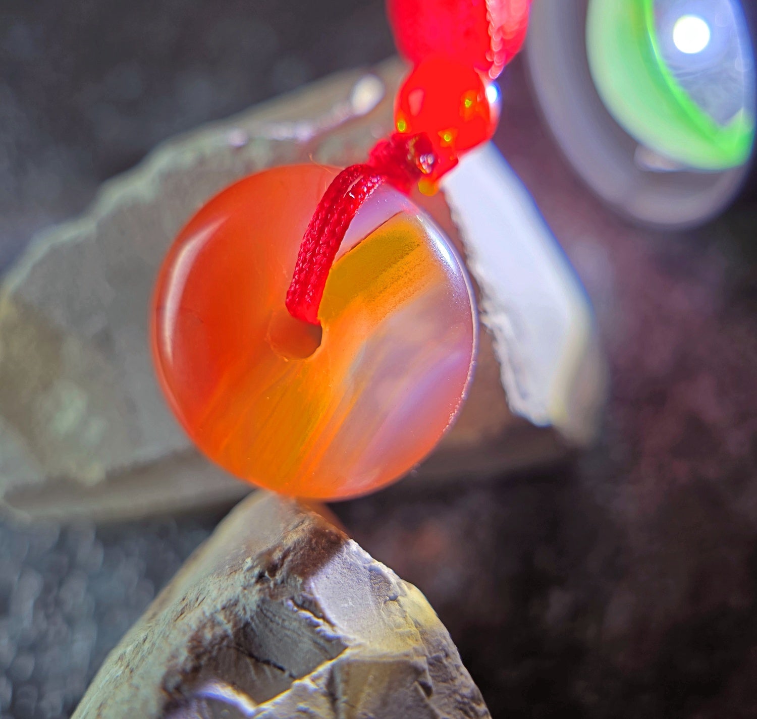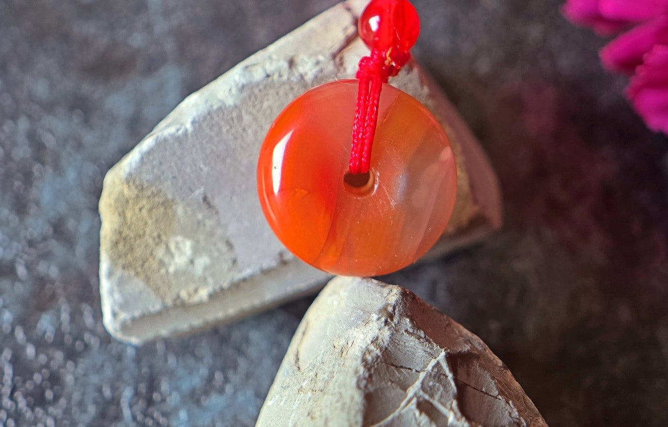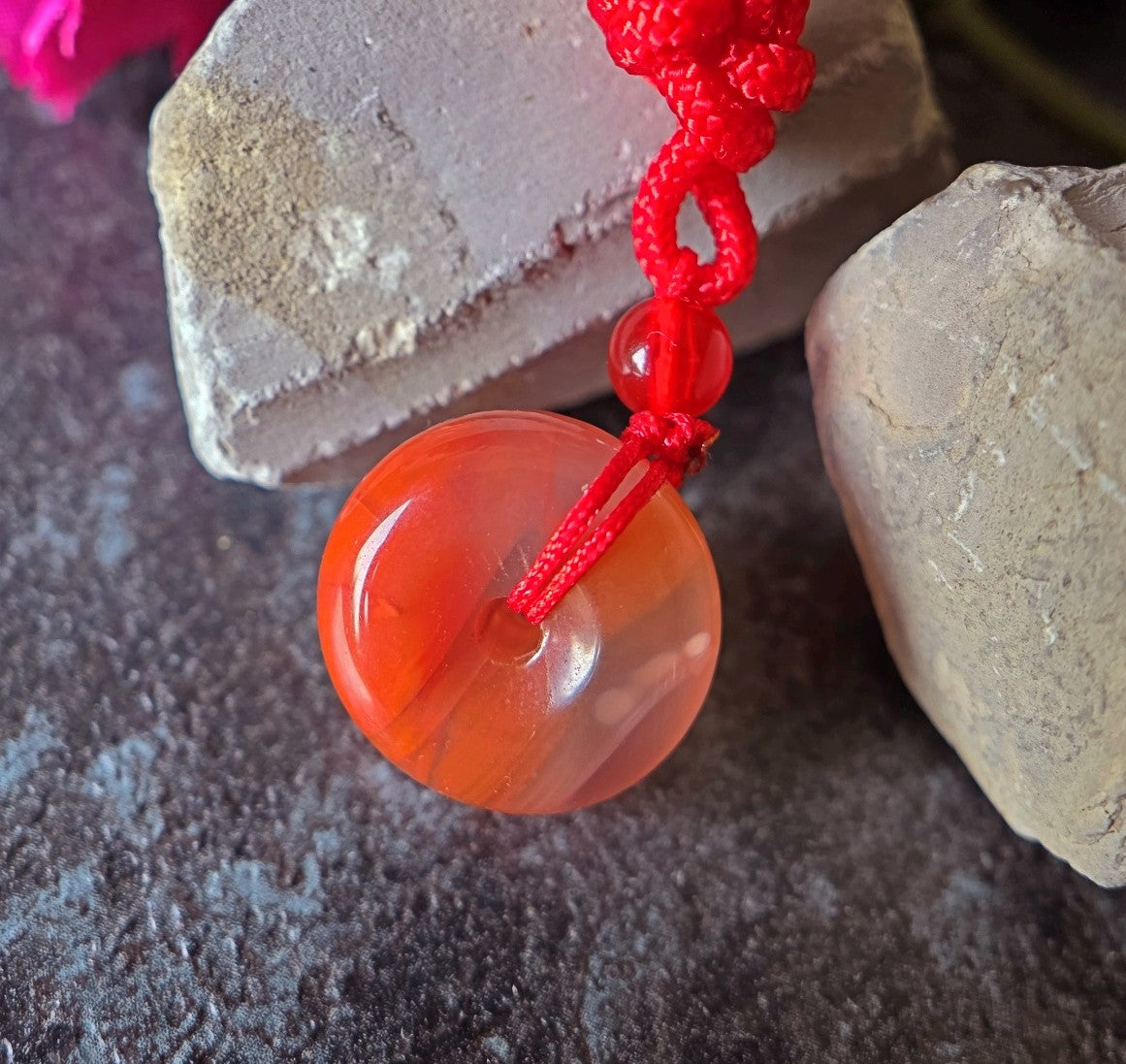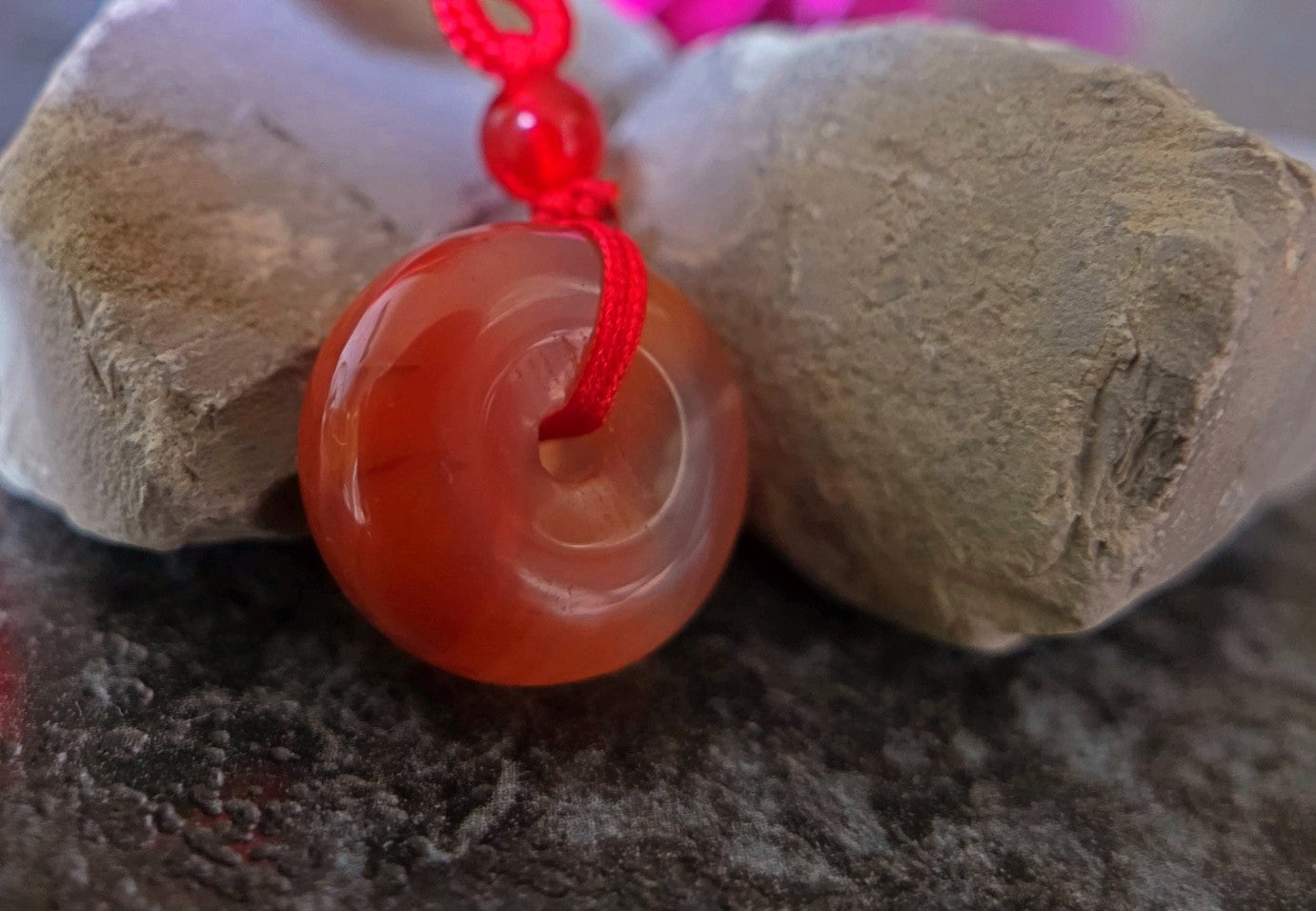 This exquisite pendant showcases a rare icy-grade South Red Agate (Nanhong), masterfully carved into a traditional donut shape (bi disc), symbolizing harmony and eternity in Chinese culture. The stone’s semi-translucent body glows with a soft pink-to-red hue, revealing naturally suspended mineral inclusions.