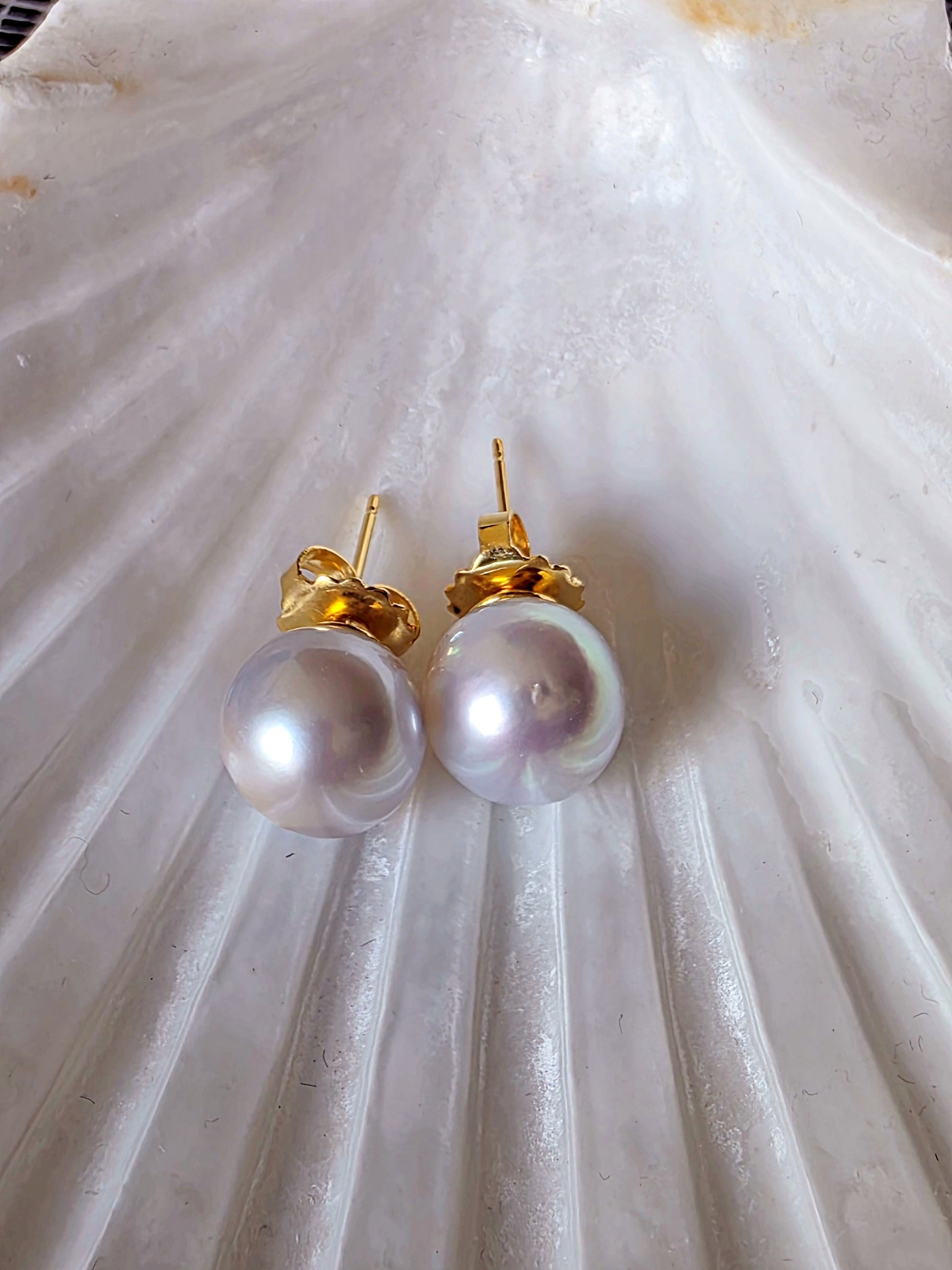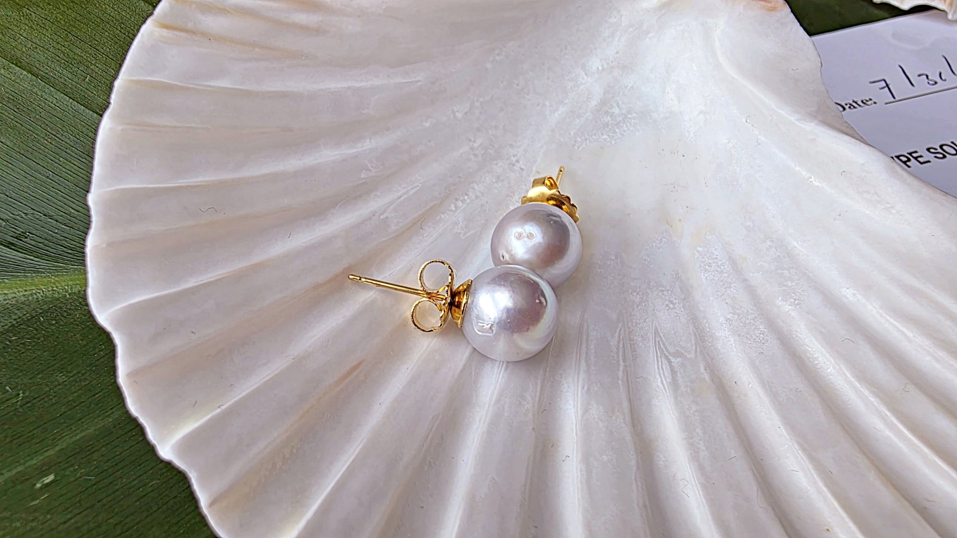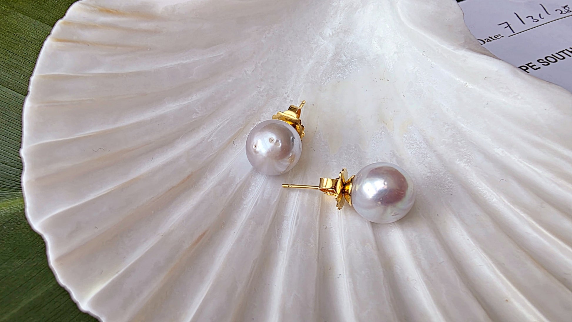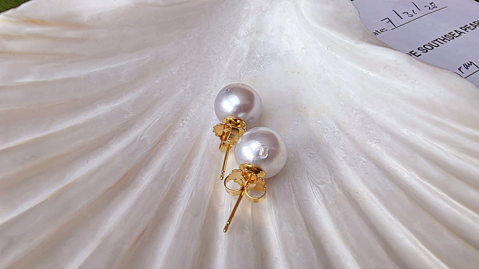 This elegant pair of stud earrings features genuine South Sea pearls, celebrated for their exceptional size, silky surface, and radiant glow. Set in 5 Micron gold backings, each pearl reflects the purity and prestige of ocean-born luxury. A subtle surface irregularity on one pearl—visible under close inspection—is a hallmark of its natural formation, confirming its untreated origin and authenticity.