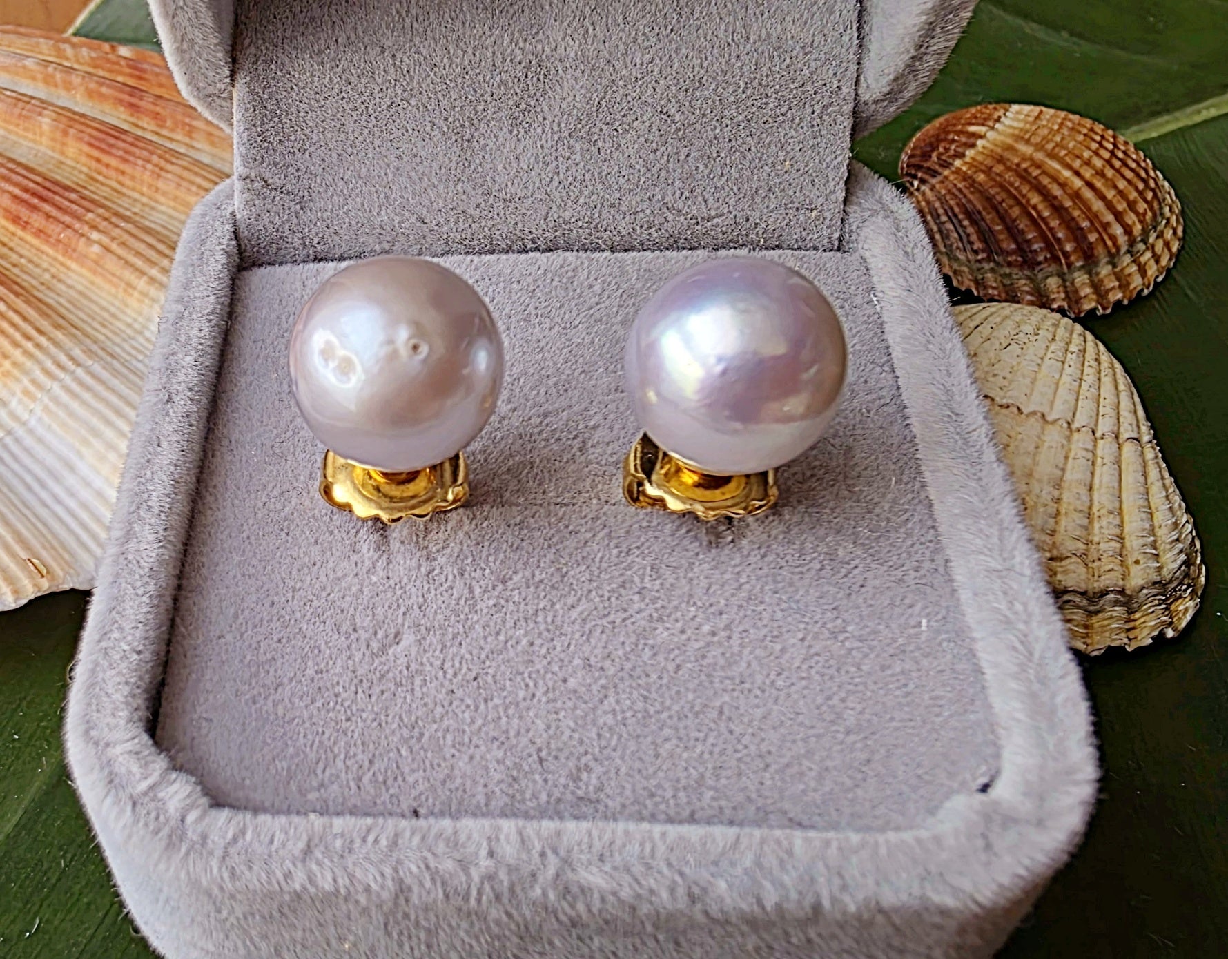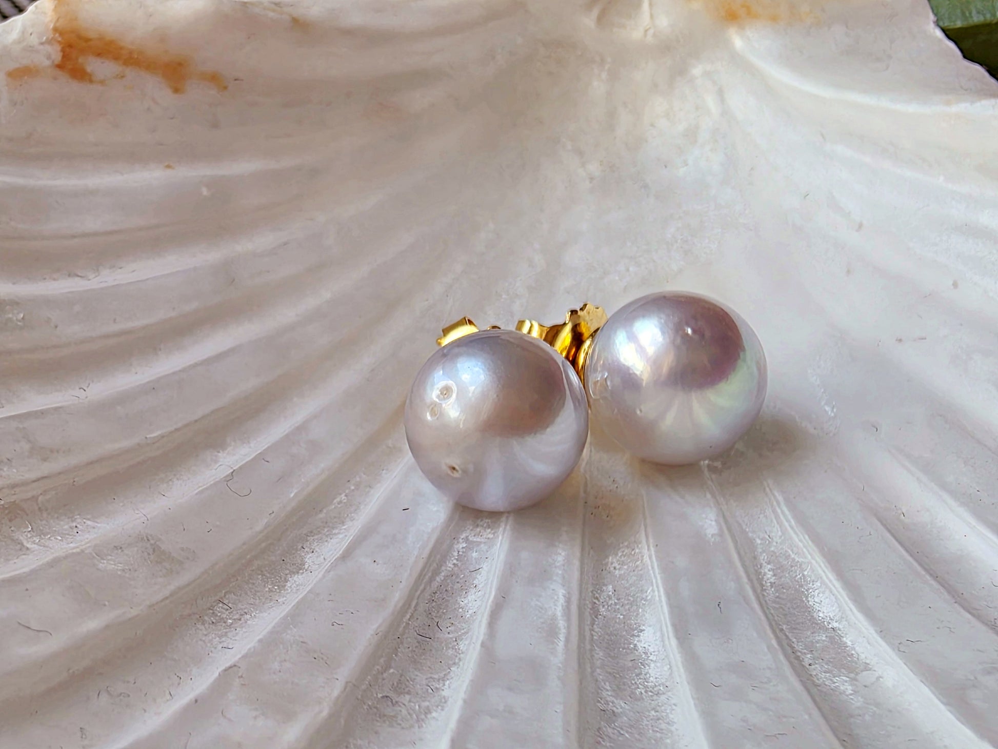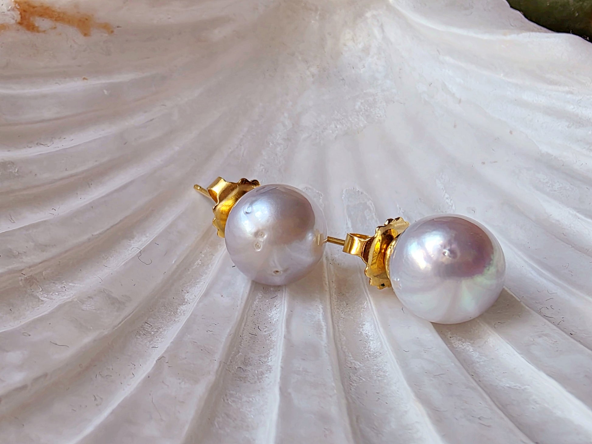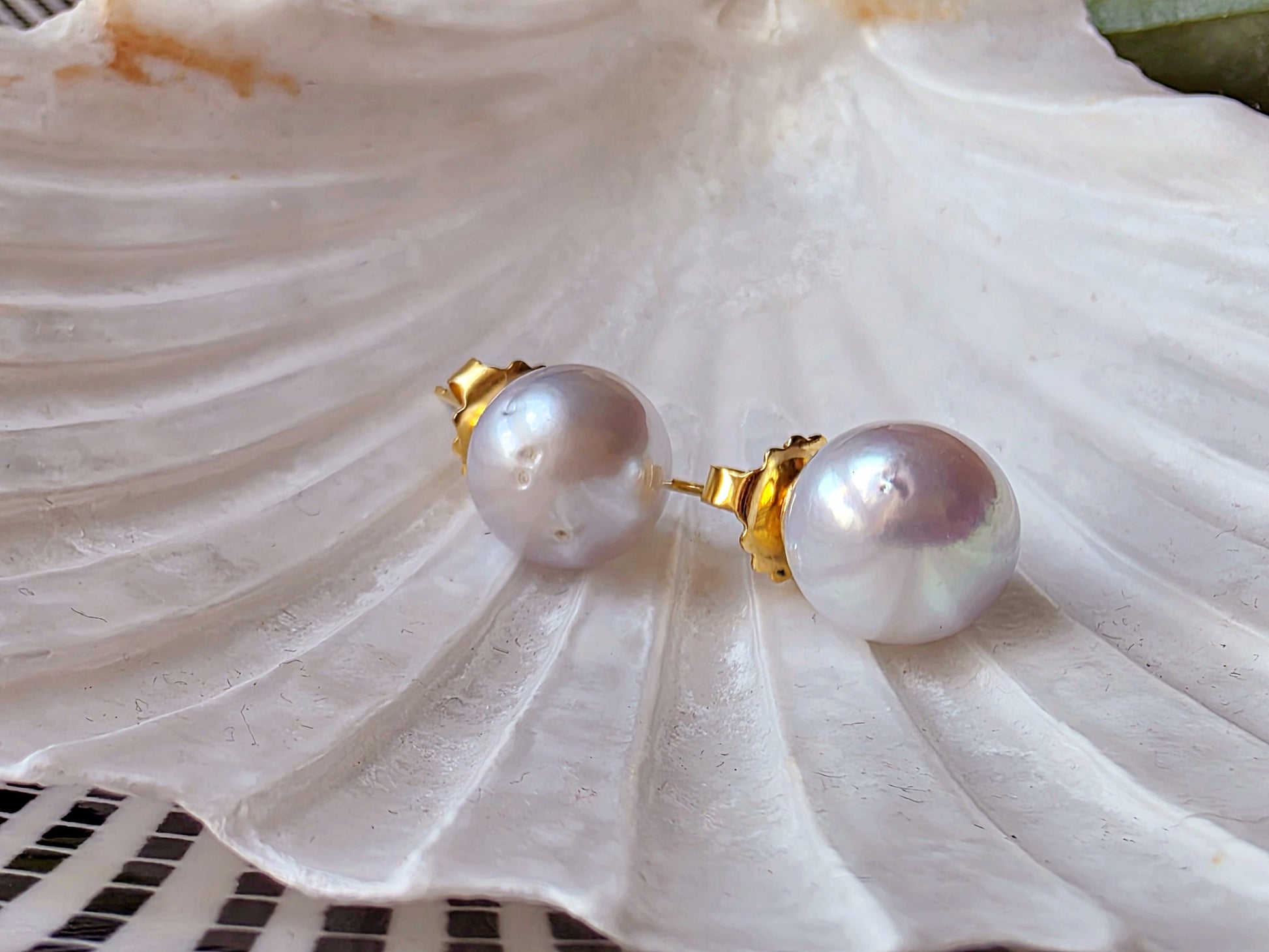 This elegant pair of stud earrings features genuine South Sea pearls, celebrated for their exceptional size, silky surface, and radiant glow. Set in 5 Micron gold backings, each pearl reflects the purity and prestige of ocean-born luxury. A subtle surface irregularity on one pearl—visible under close inspection—is a hallmark of its natural formation, confirming its untreated origin and authenticity.