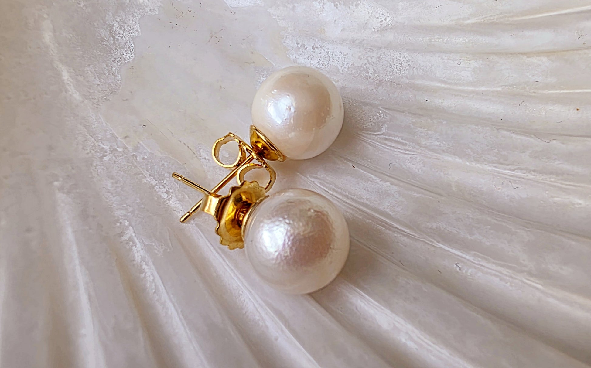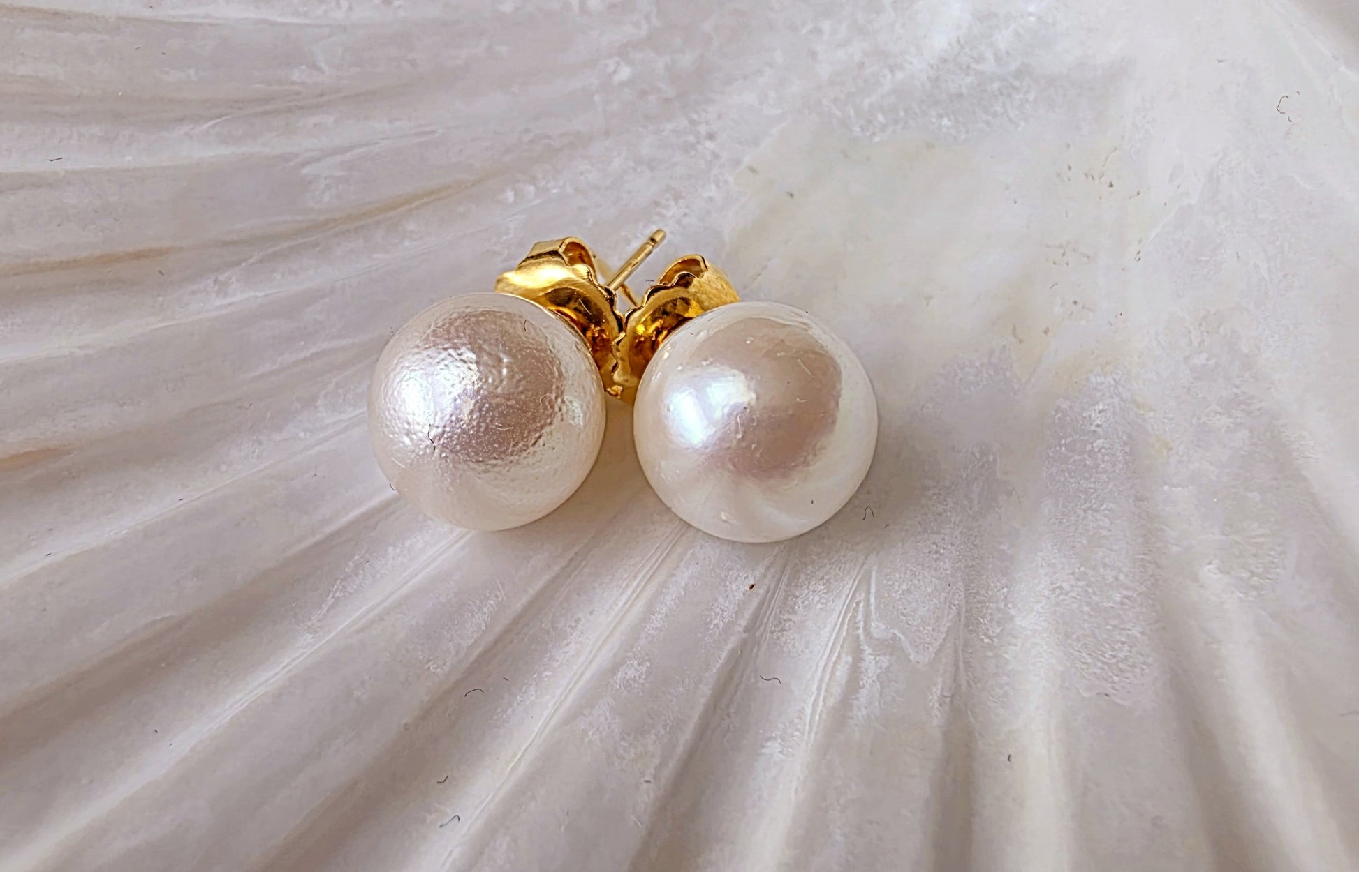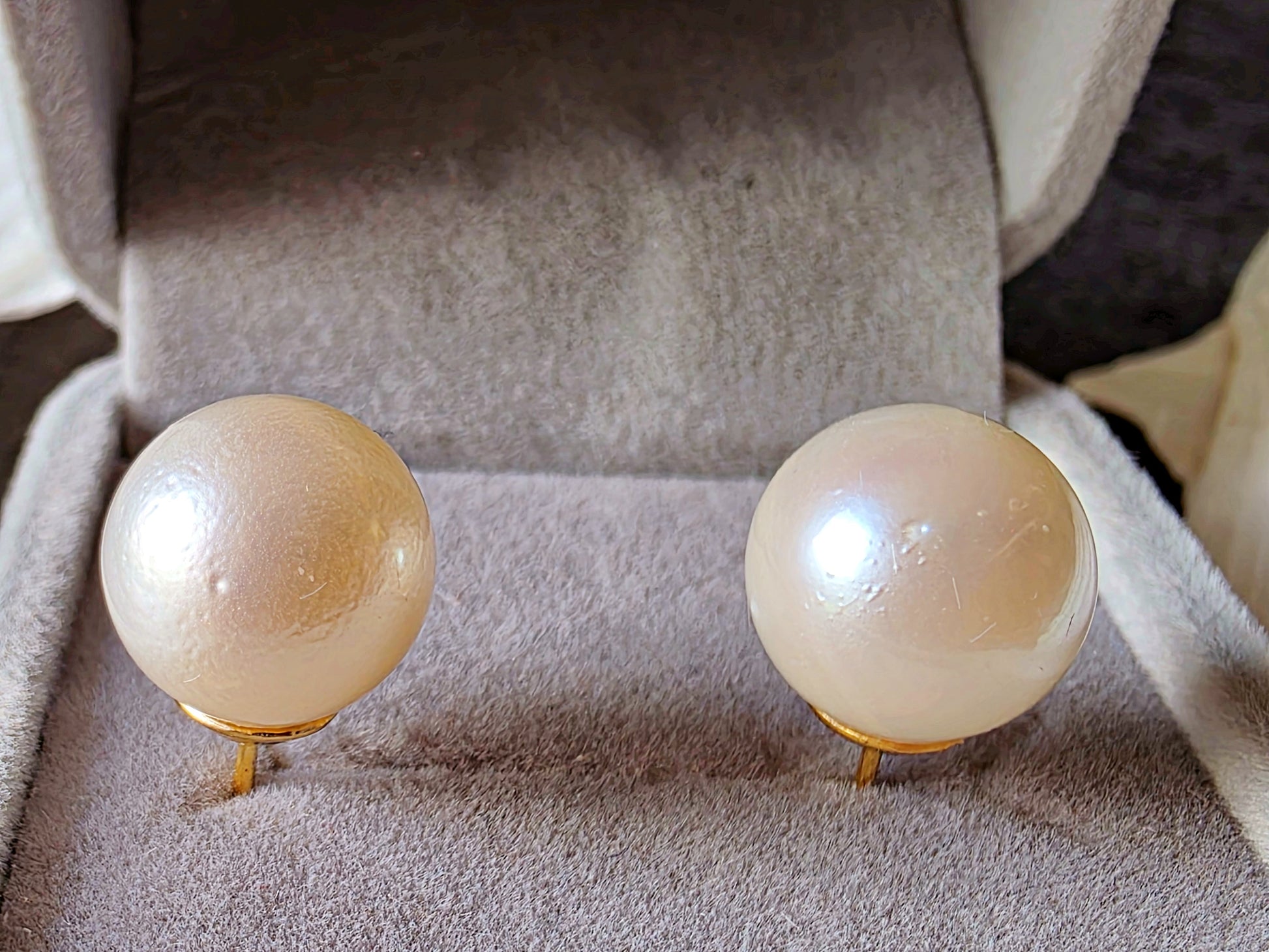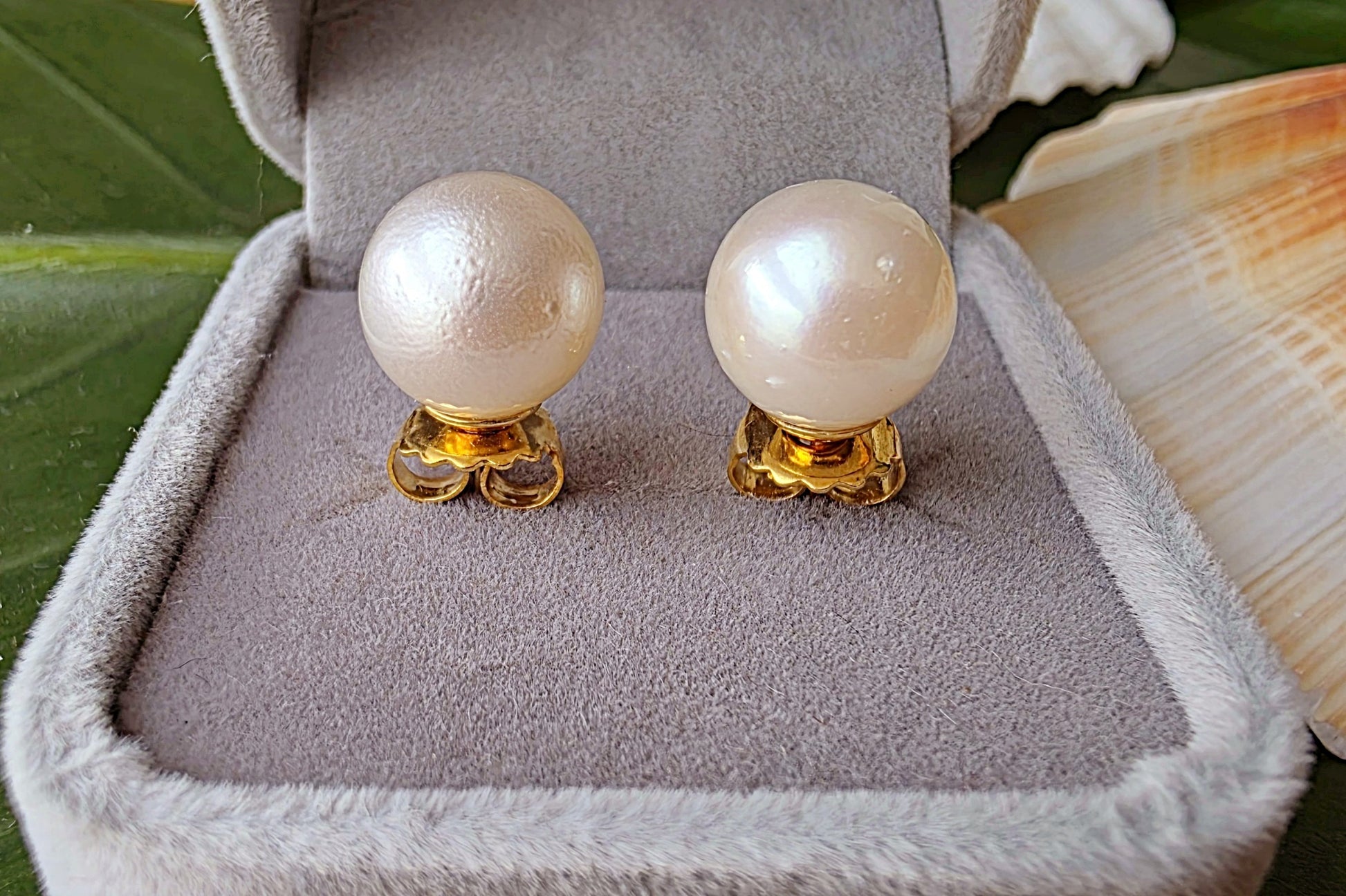 This elegant pair of stud earrings features genuine South Sea pearls, celebrated for their exceptional size, silky luster, and timeless appeal. Set in classic gold posts, each pearl displays a soft iridescence and smooth nacre surface. A subtle surface imperfection—visible upon close inspection—serves as a hallmark of authenticity, confirming the pearls are natural and untreated, formed organically in the warm waters of the South Pacific.