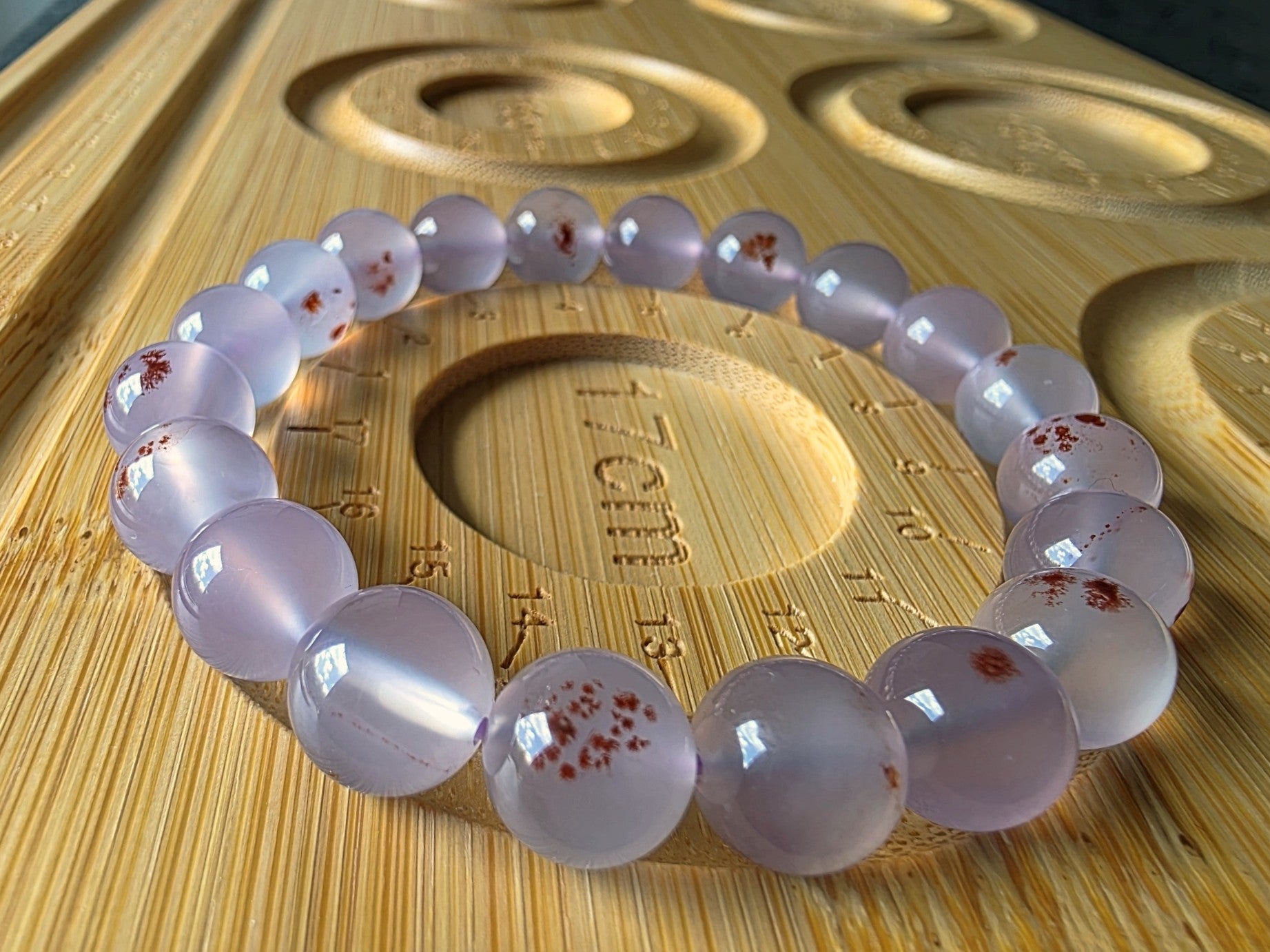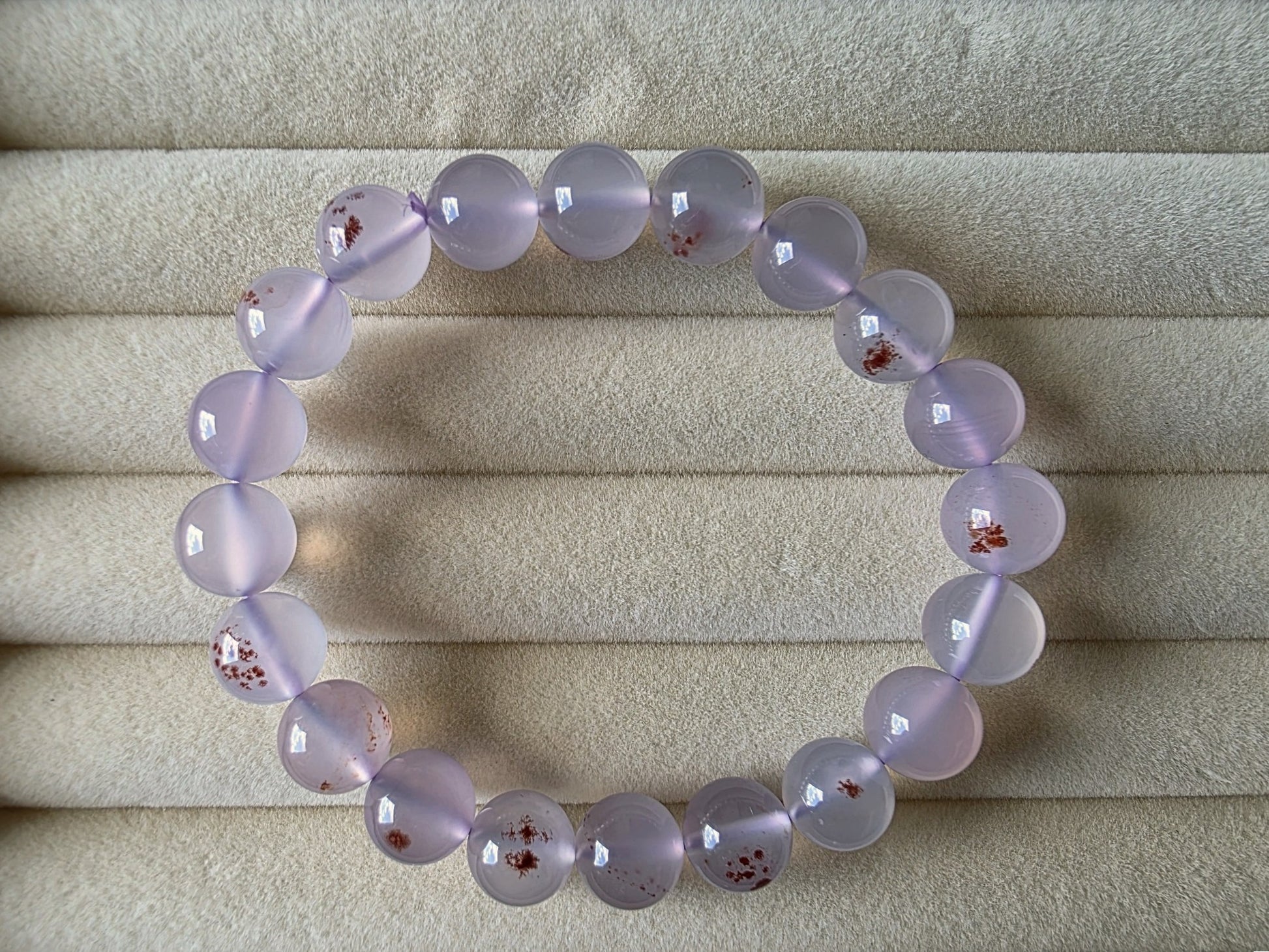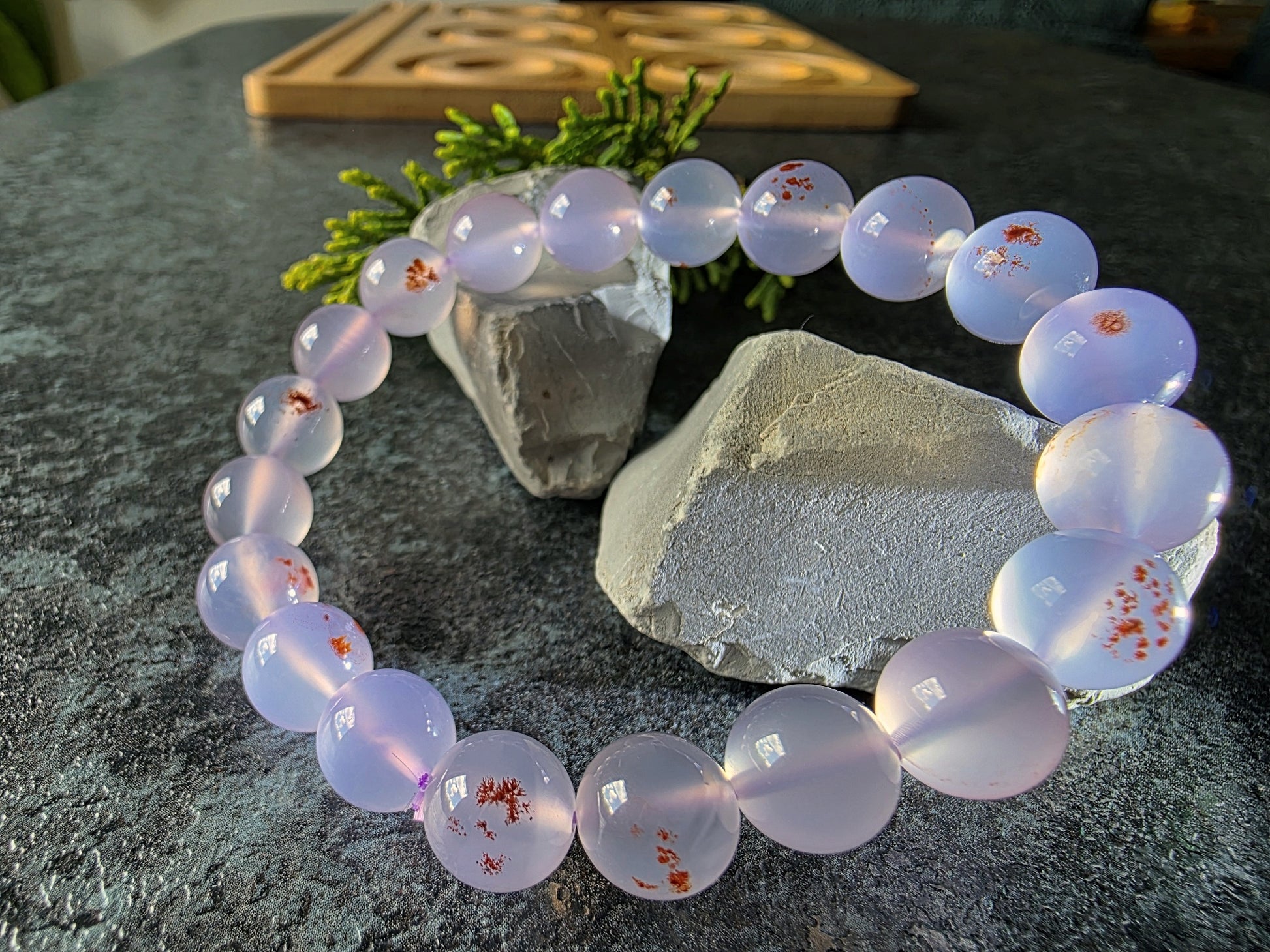 This exquisite bracelet features premium-grade icy Nanhong agate beads, celebrated for their translucent clarity and deep lavender undertones. Each bead is meticulously polished to reveal floating mineral inclusions, which create a mesmerizing depth effect—hallmarks of untreated, natural agate. The subtle interplay of light and internal texture gives this piece a serene, ethereal quality that elevates its rarity and collector appeal.
