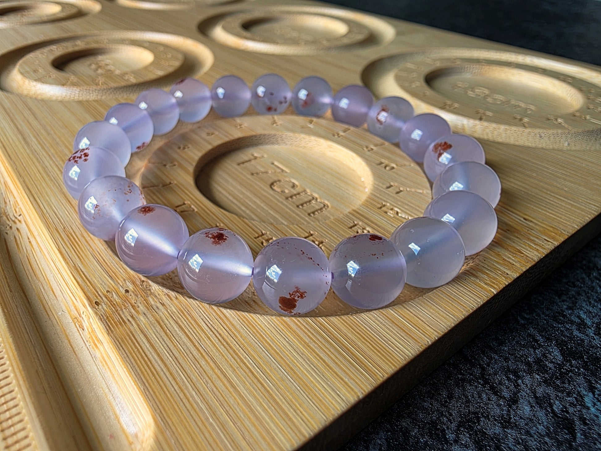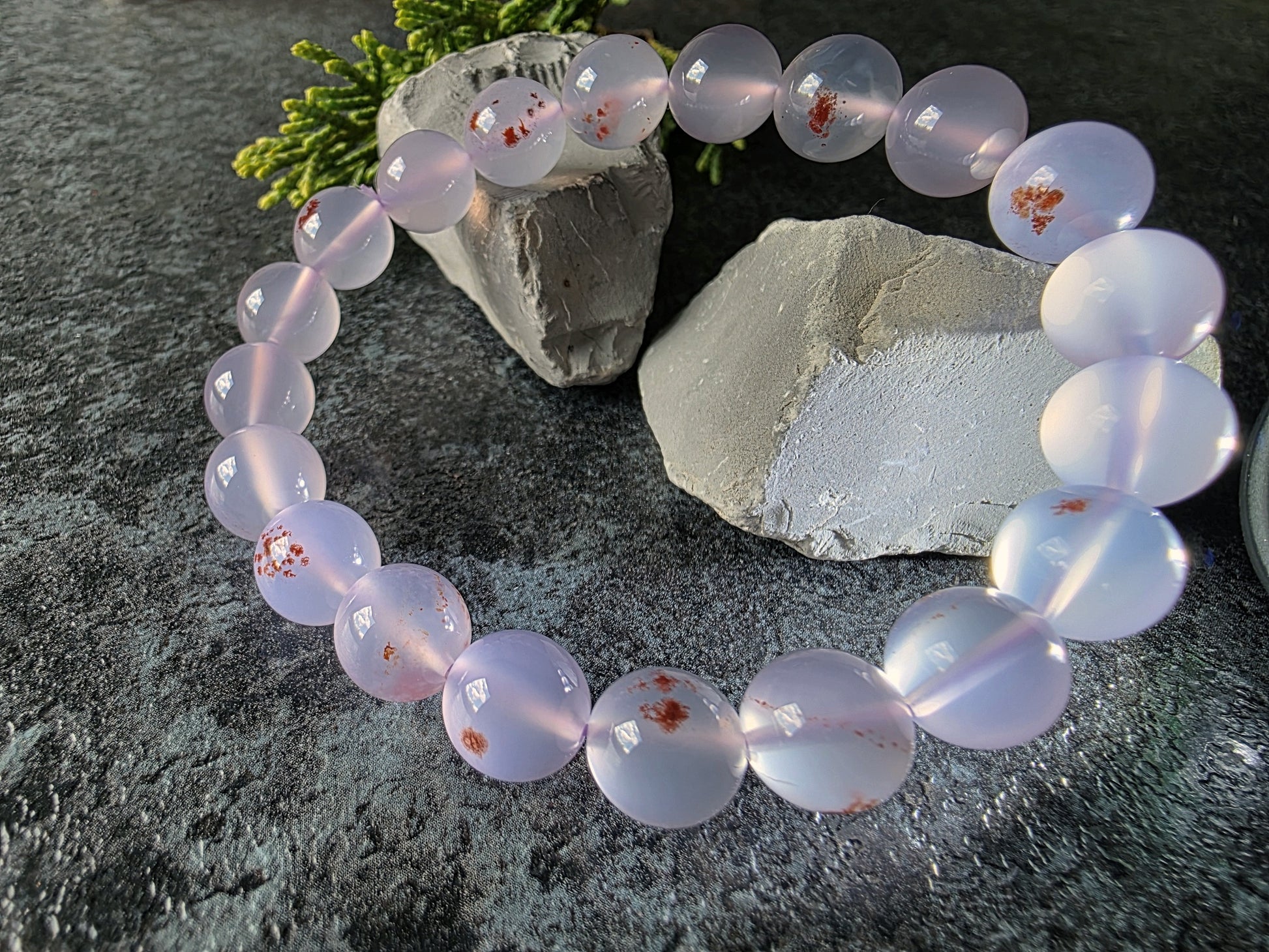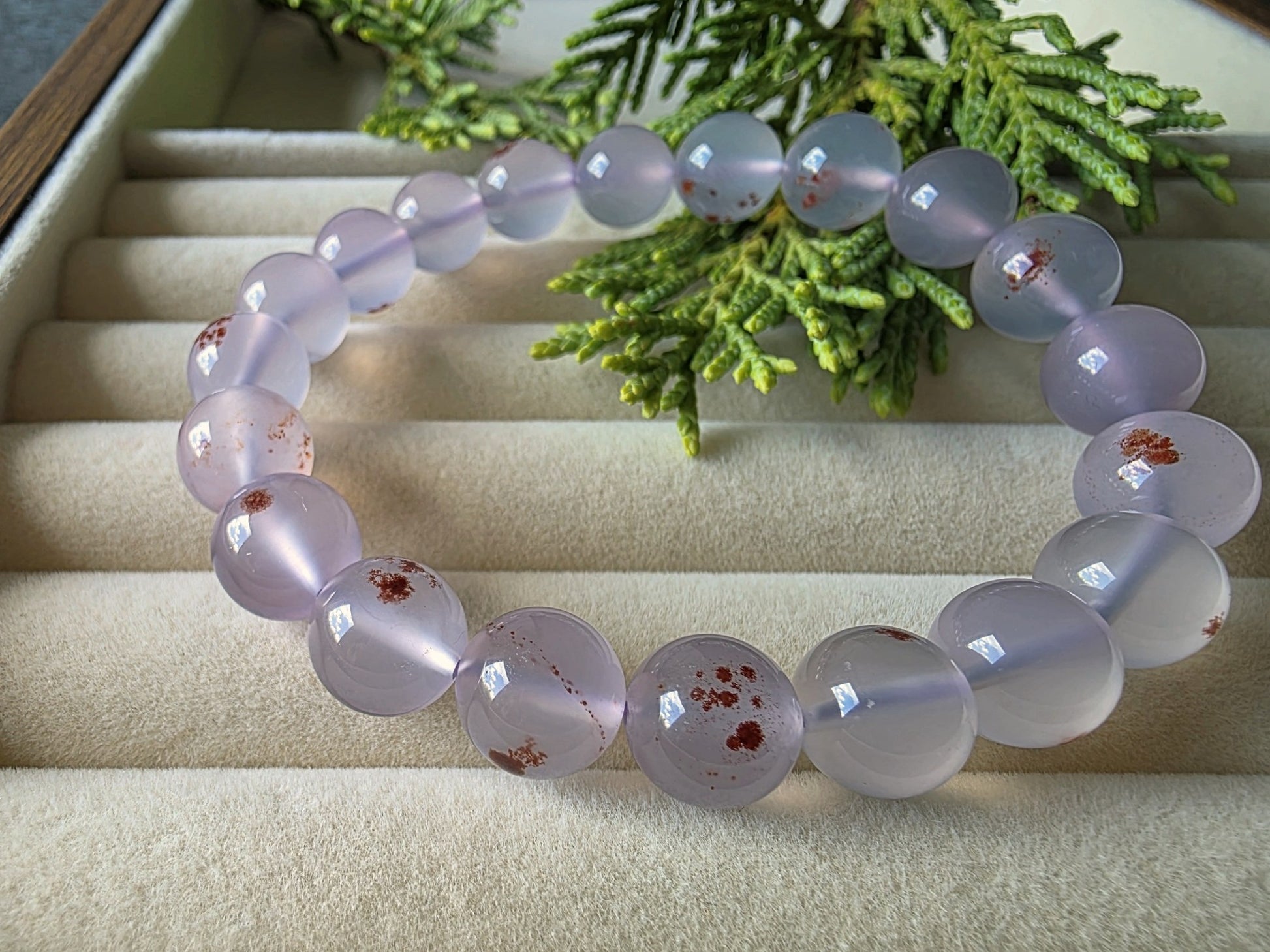 This exquisite bracelet features premium-grade icy Nanhong agate beads, celebrated for their translucent clarity and deep lavender undertones. Each bead is meticulously polished to reveal floating mineral inclusions, which create a mesmerizing depth effect—hallmarks of untreated, natural agate. The subtle interplay of light and internal texture gives this piece a serene, ethereal quality that elevates its rarity and collector appeal.